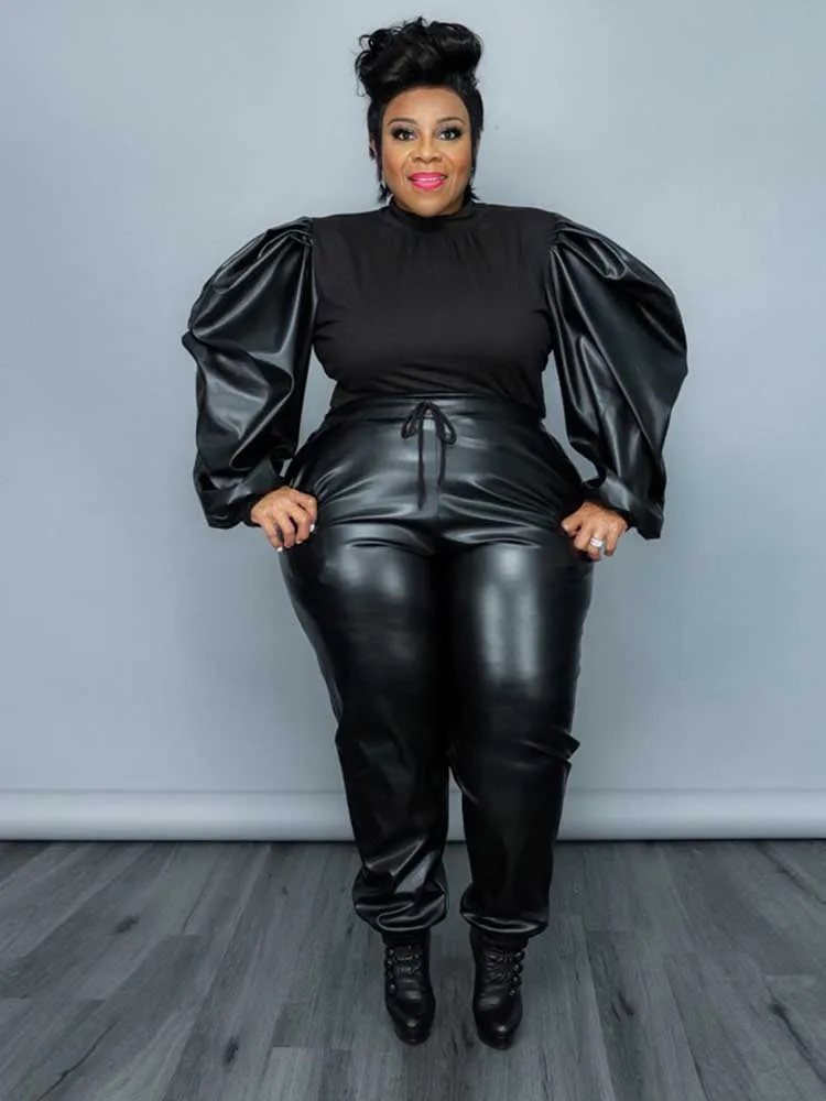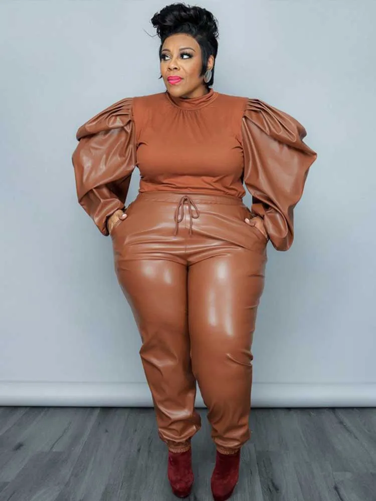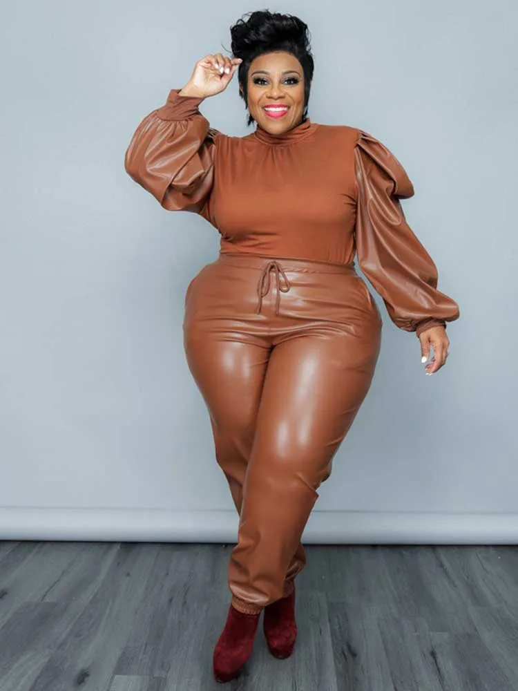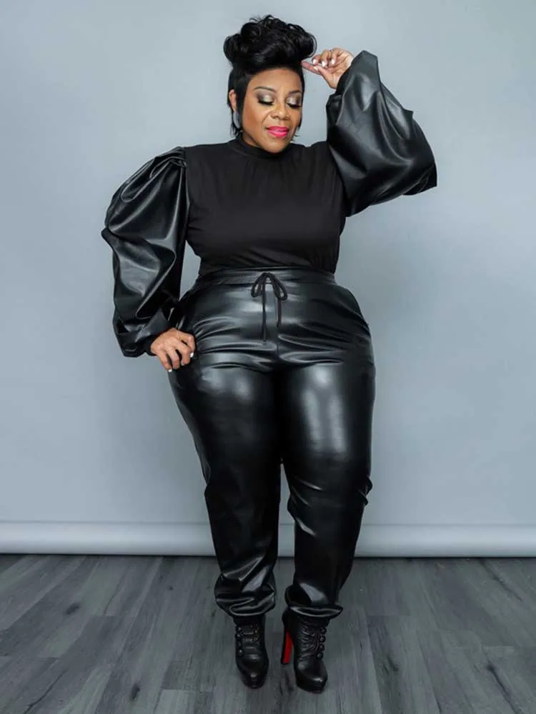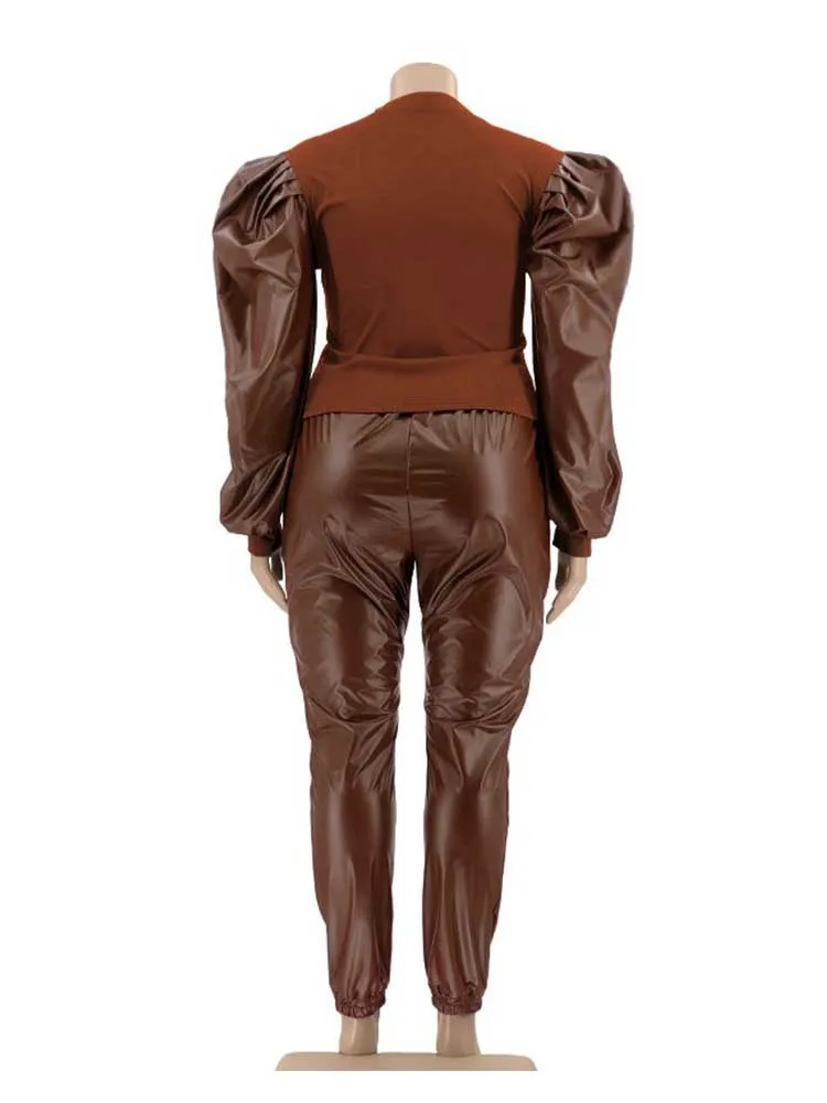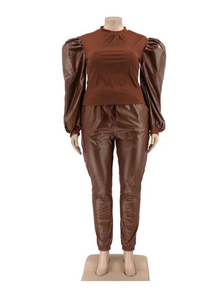 Damen Plus Size Zweiteiler Herbst & Winter - Conjunto de patchwork de PU & Strick mit Oberteil und Lederlook-Hose, Große Größen 2XL–5XL