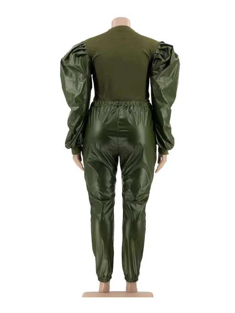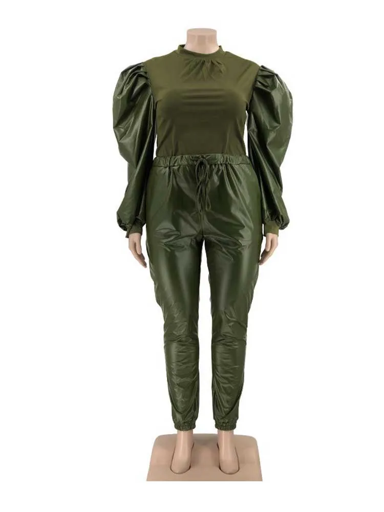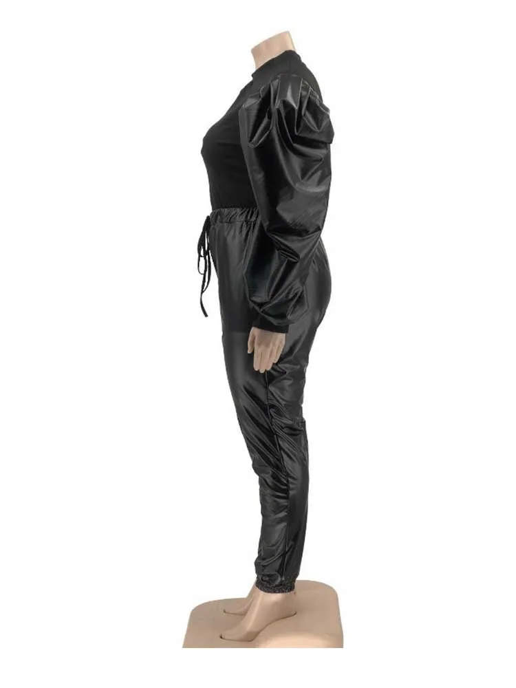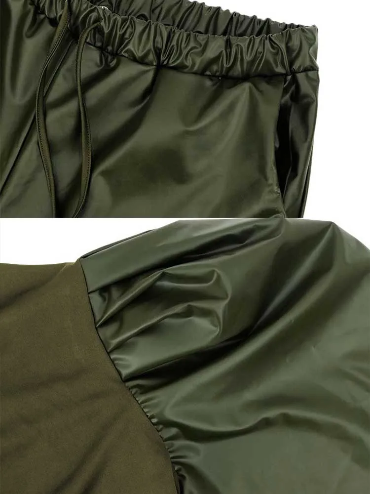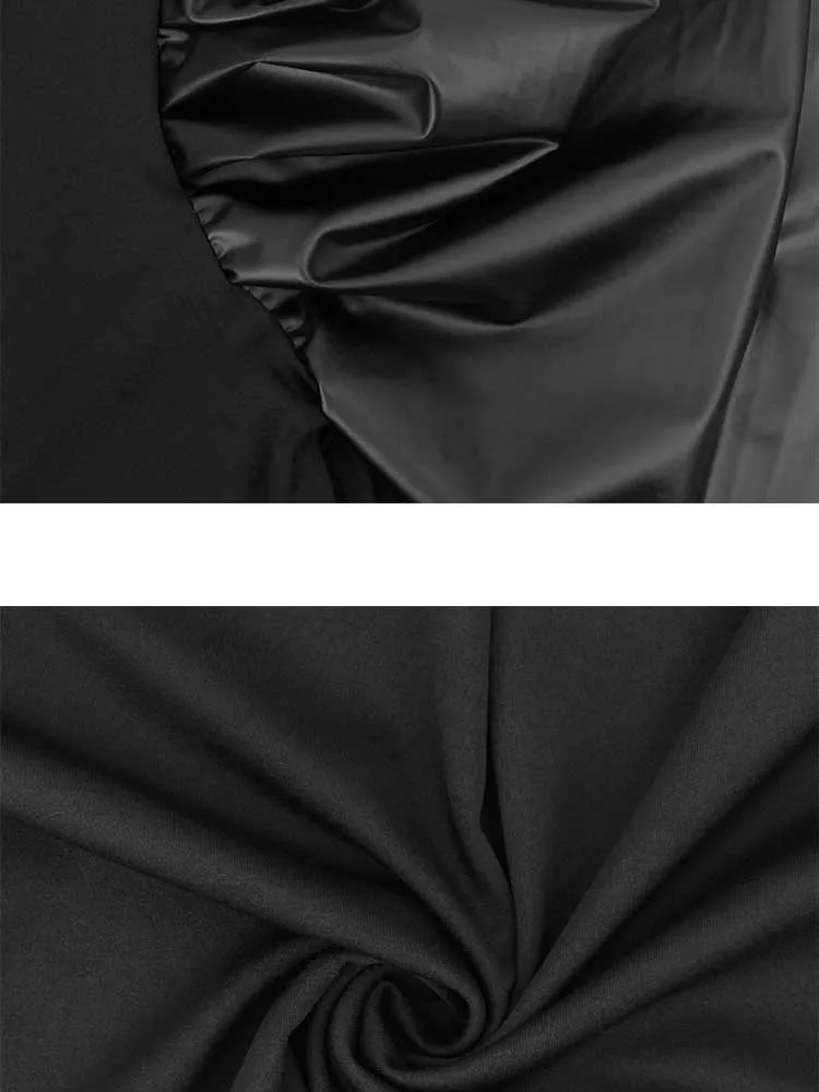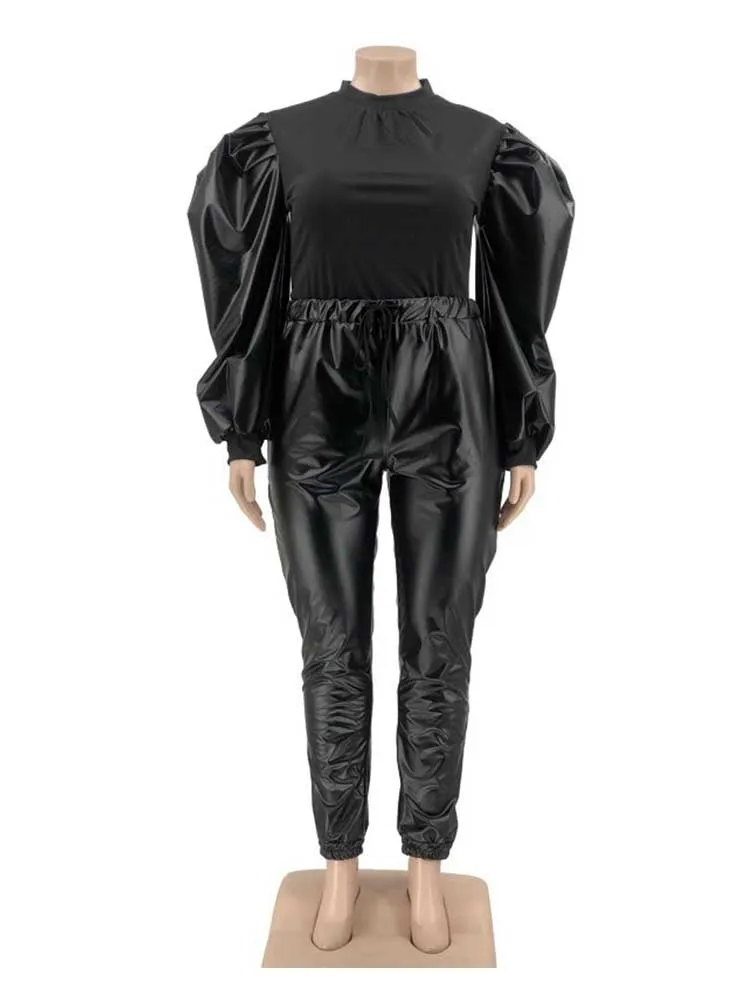Damen Plus Size Zweiteiler Herbst & Winter - Conjunto de patchwork de PU & Strick mit Oberteil und Lederlook-Hose, Große Größen 2XL–5XL