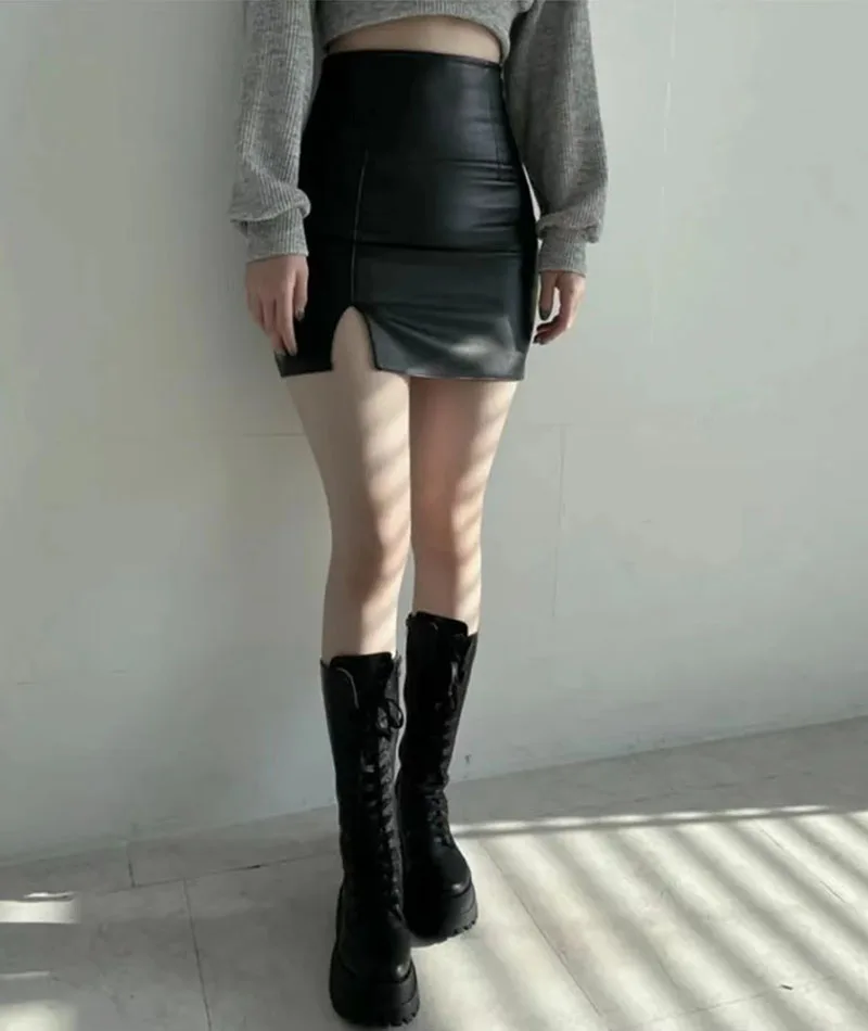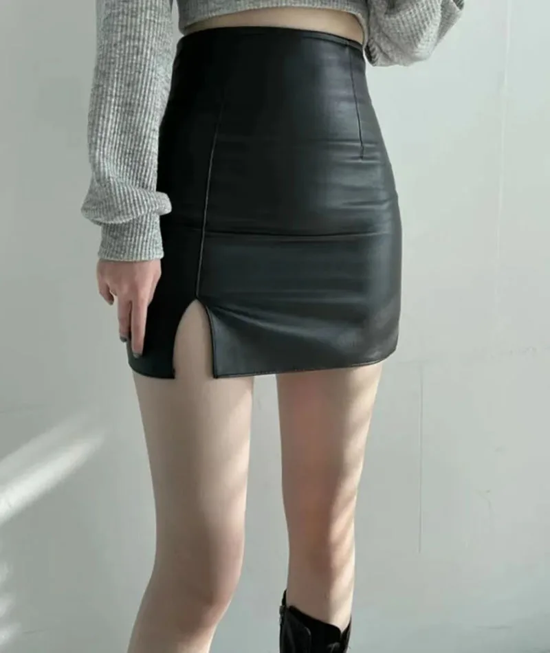 Minirock de piel sintética para mujer: negro, de cintura alta, rock con seitlichem Schlitz, línea A delgada en estilo de oficina coreano para hierbas e invierno.