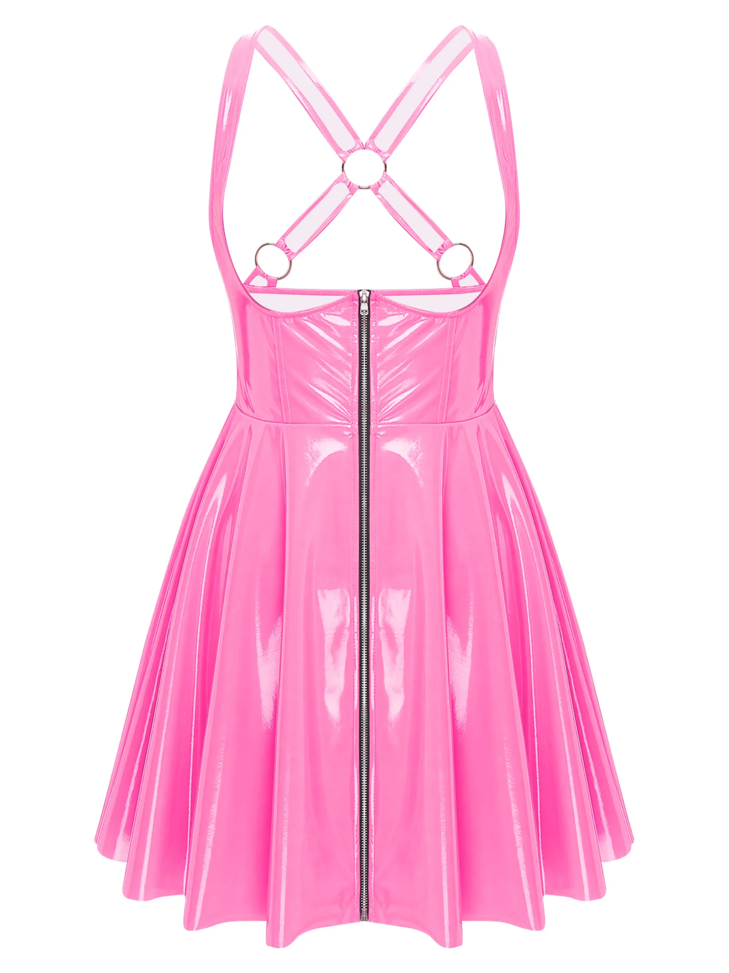 Ropa de cuero de PU con apariencia húmeda y estilo gótico punk: vestido ceñido al cuerpo con cremallera frontal, copas recortadas y una línea A asimétrica