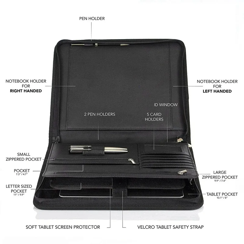 Das durchdachte Innenleben bietet zahlreiche Fächer und Halterungen für einen strukturierten Arbeitsalltag. Ausgestattet mit Stiftschlaufe, Visitenkartenfächern, Dokumentenfächern, Notiz- und Zubehörslots , behalten Sie jederzeit den Überblick. Alles Wichtige ist griffbereit und ordentlich organisiert – kein Suchen, kein Chaos.