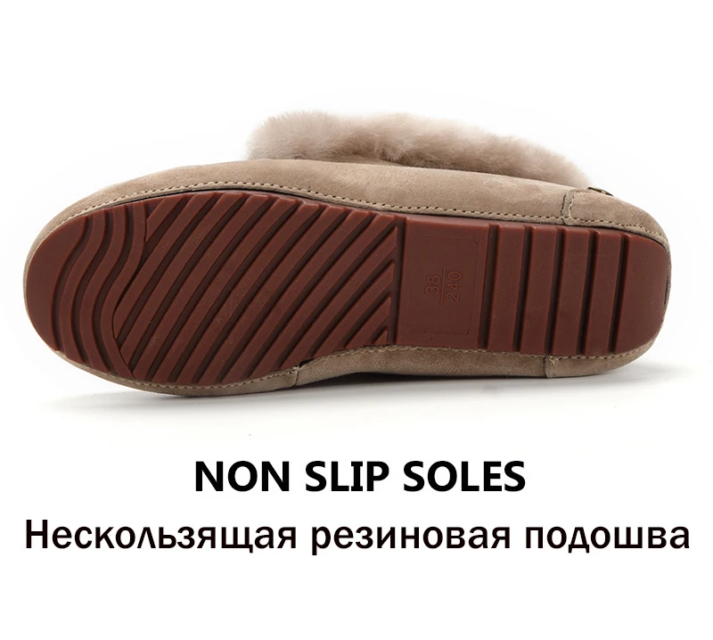 Das Obermaterial aus echtem Pigskin-Leder ist strapazierfähig und angenehm weich. El forro natural de lana es ideal para un calor óptimo, mientras que el forro polar de piel de oveja es muy cálido. Die gummierte Außensohle garantiert sicheren Halt auf glatten oder rutschigen Untergründen, ideal for Schnee, Frost oder kalte Wintertage. Die Flats sind wasserdicht und bieten somit Schutz bei leichtem Schnee oder Nässe.