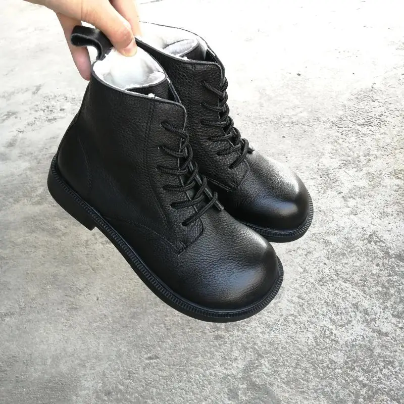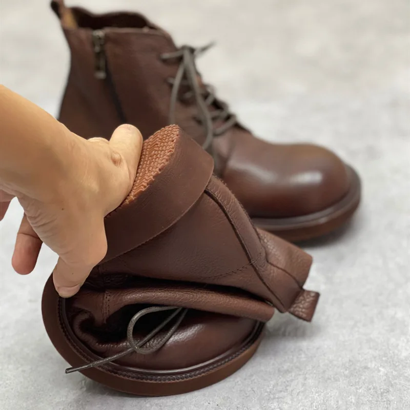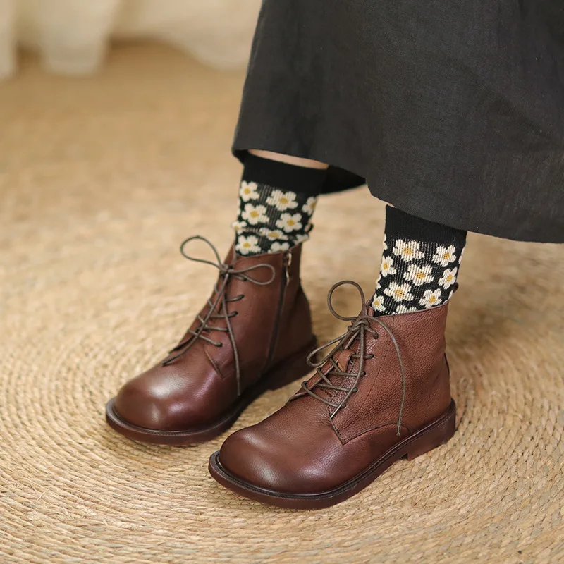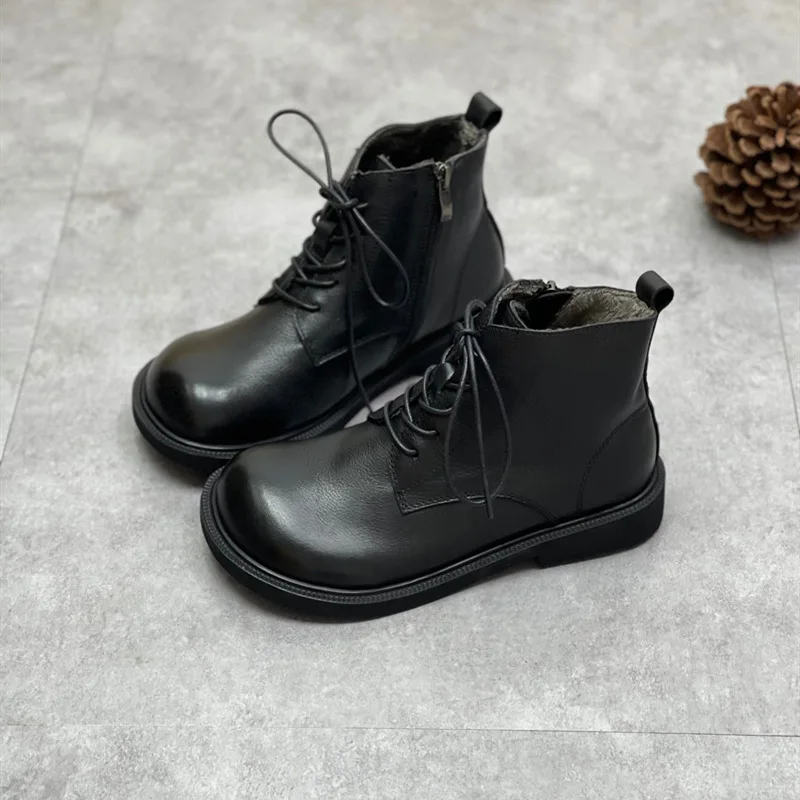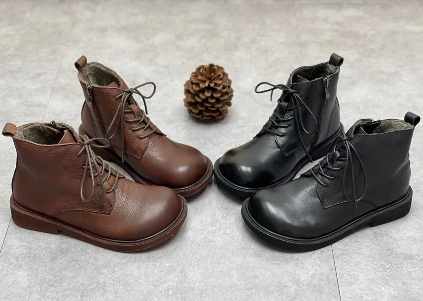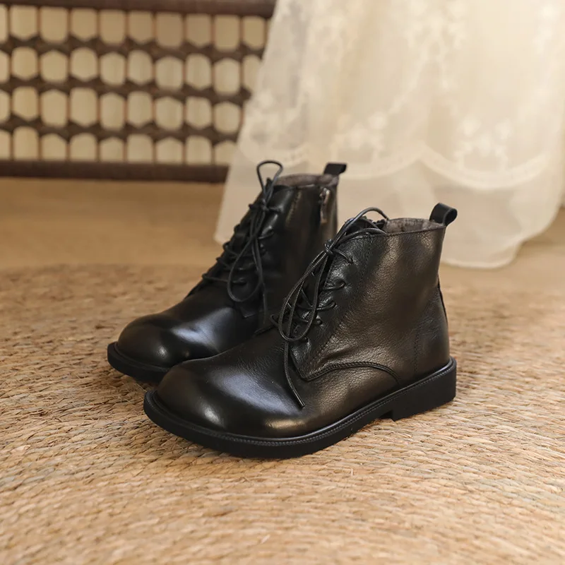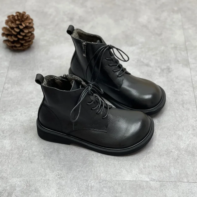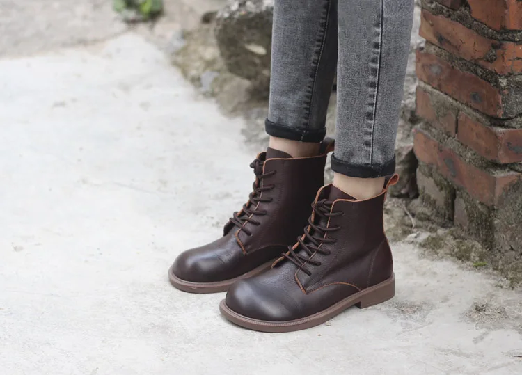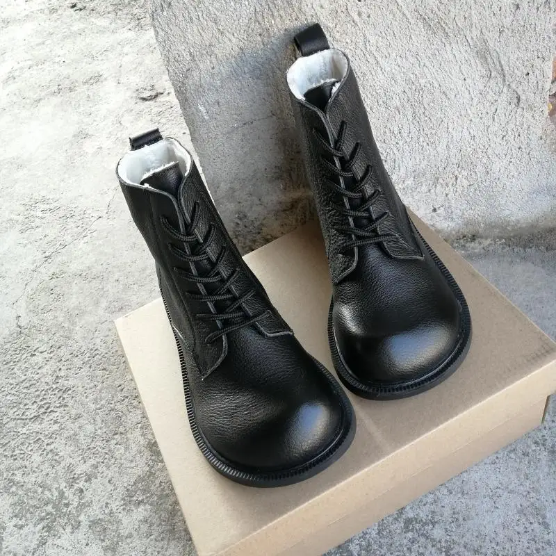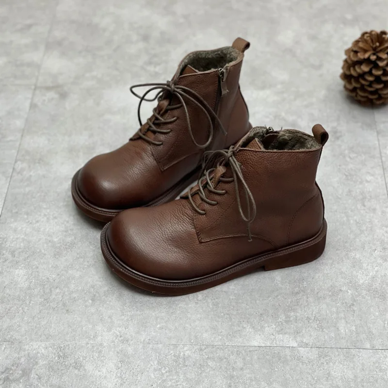 Handgefertigte Damen Leder Kurzstiefel aus Echtleder – Bequeme Flat Heel Boots mit breiter Zehenform, Warme Freizeitstiefel im British Style