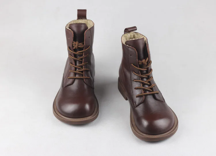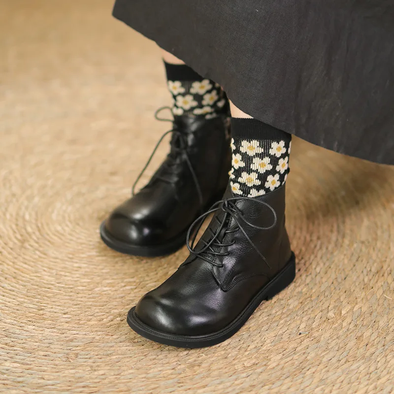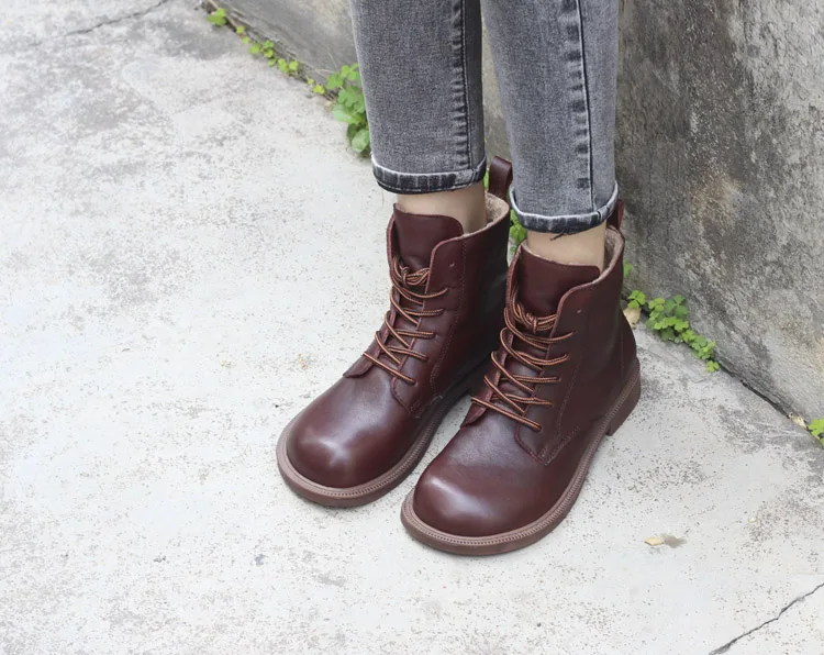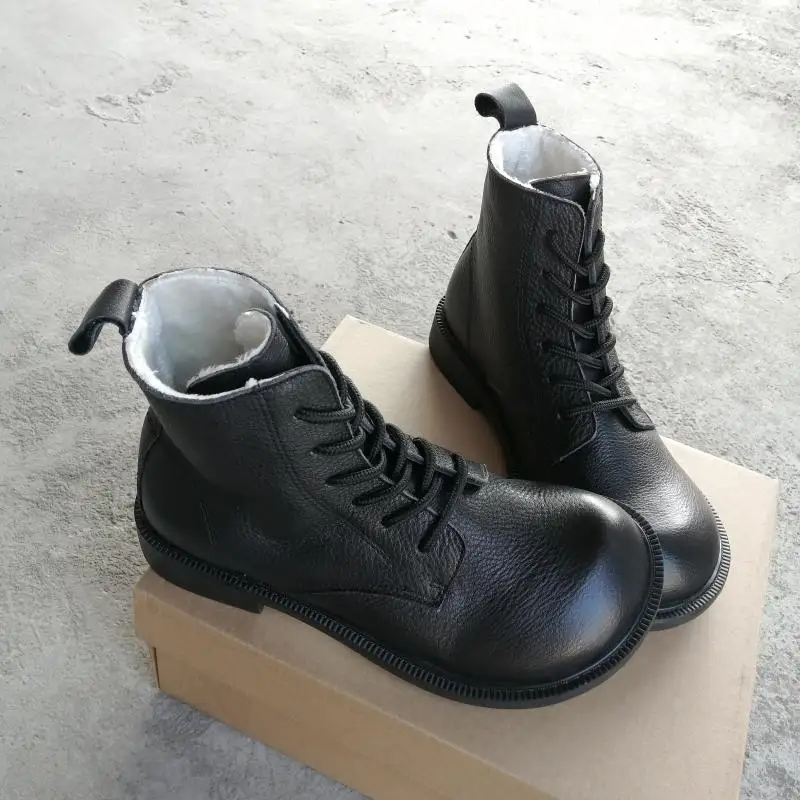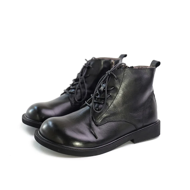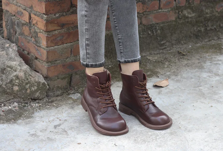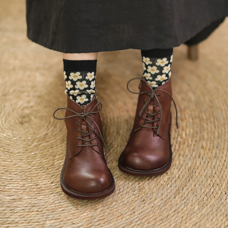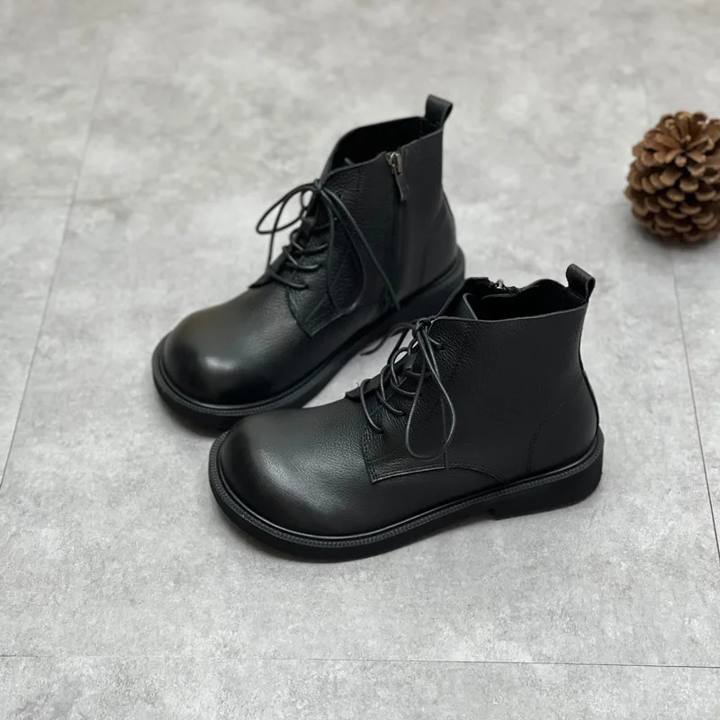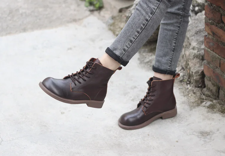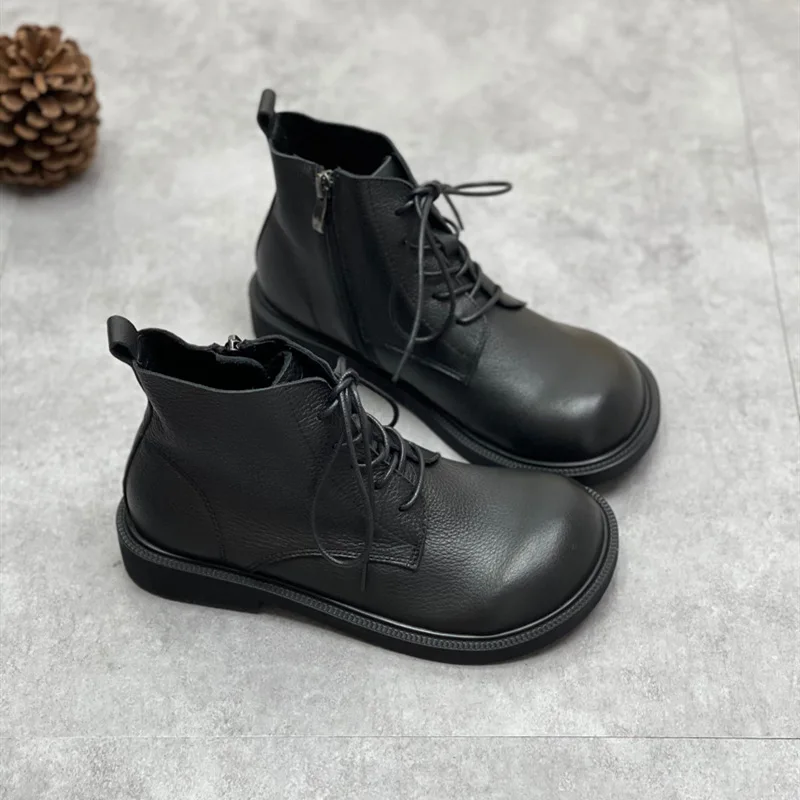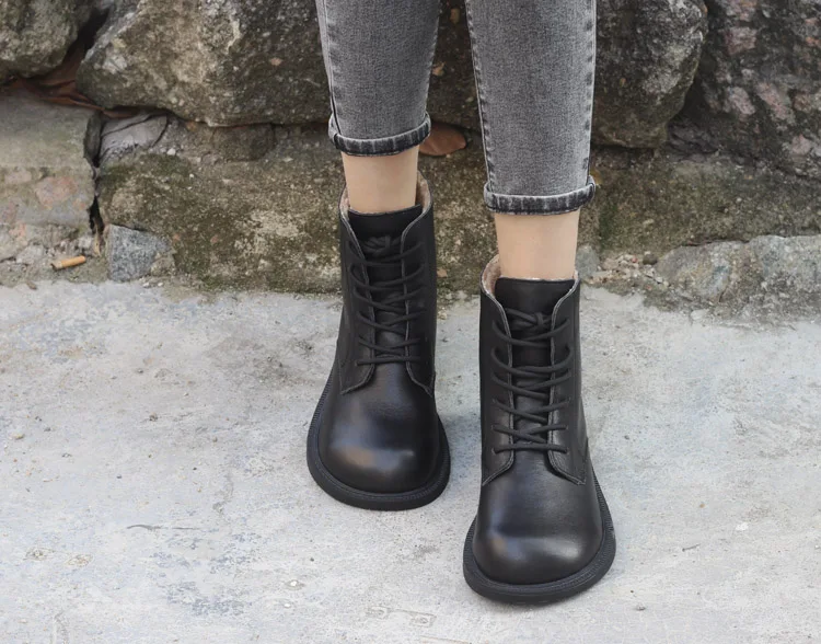 Handgefertigte Damen Leder Kurzstiefel aus Echtleder – Bequeme Flat Heel Boots mit breiter Zehenform, Warme Freizeitstiefel im British Style