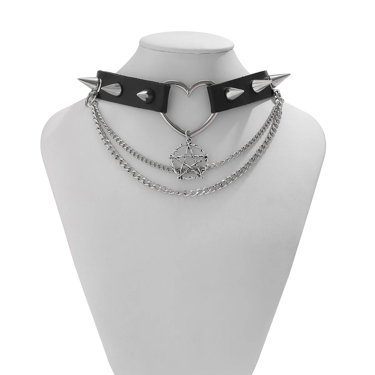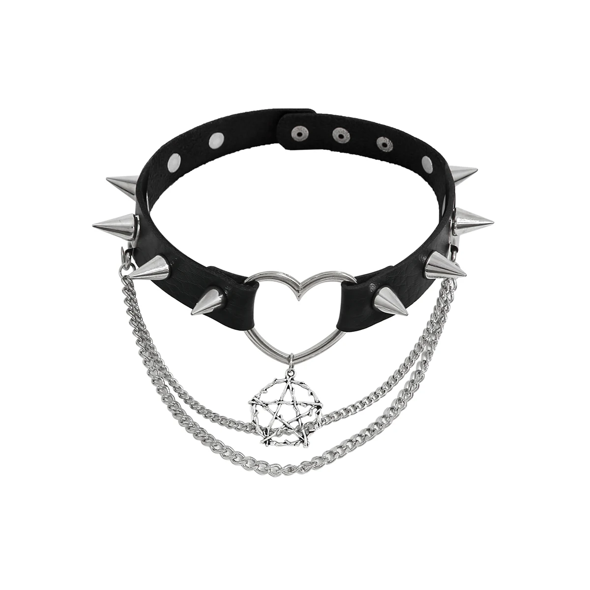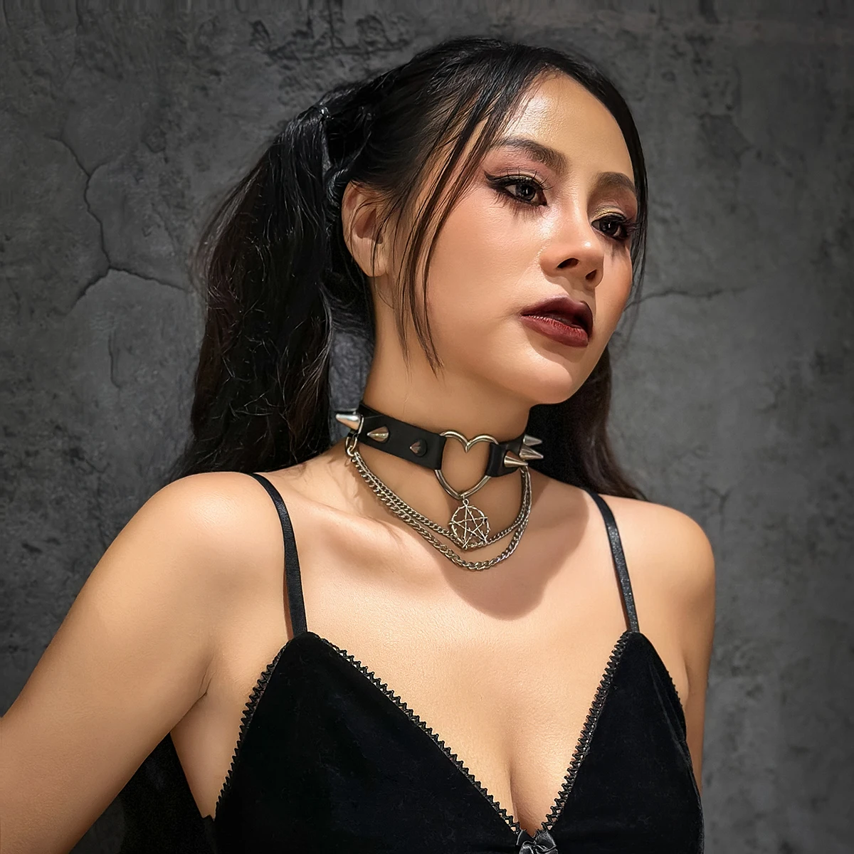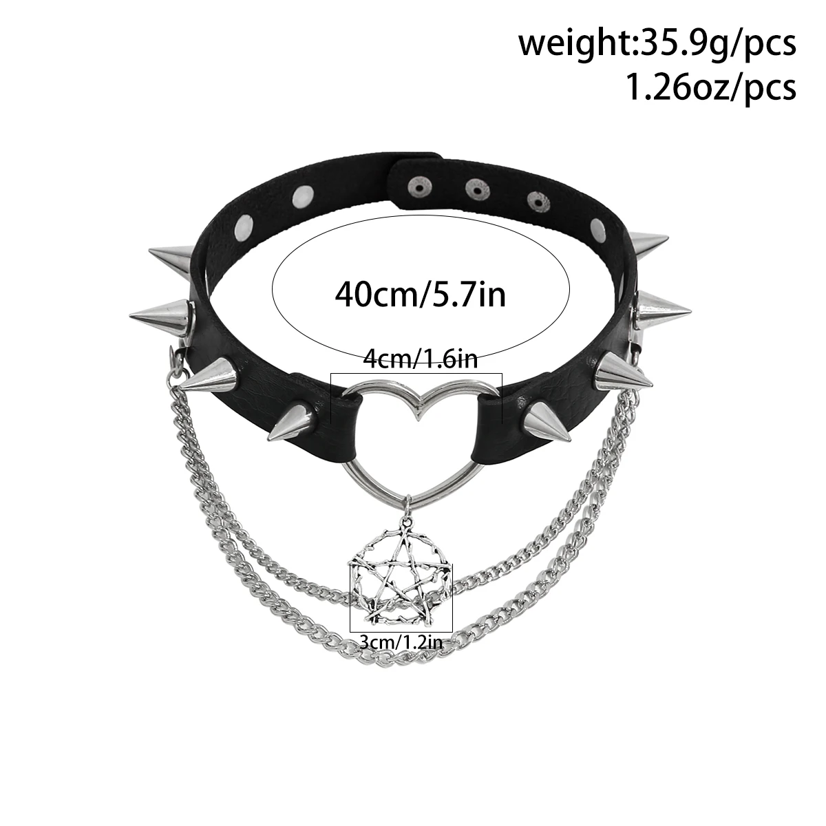 Das Halsband besteht aus sorgfältig verarbeitetem PU-Leder mit glatter Oberfläche und angenehmer Haptik. Es ist formstabil, pflegeleicht und langlebig – ideal para häufiges Tragen. Die metallischen Nieten und der Stern-Anhänger setzen starke Kontraste und unterstreichen den rebellischen Charakter des Chokers.