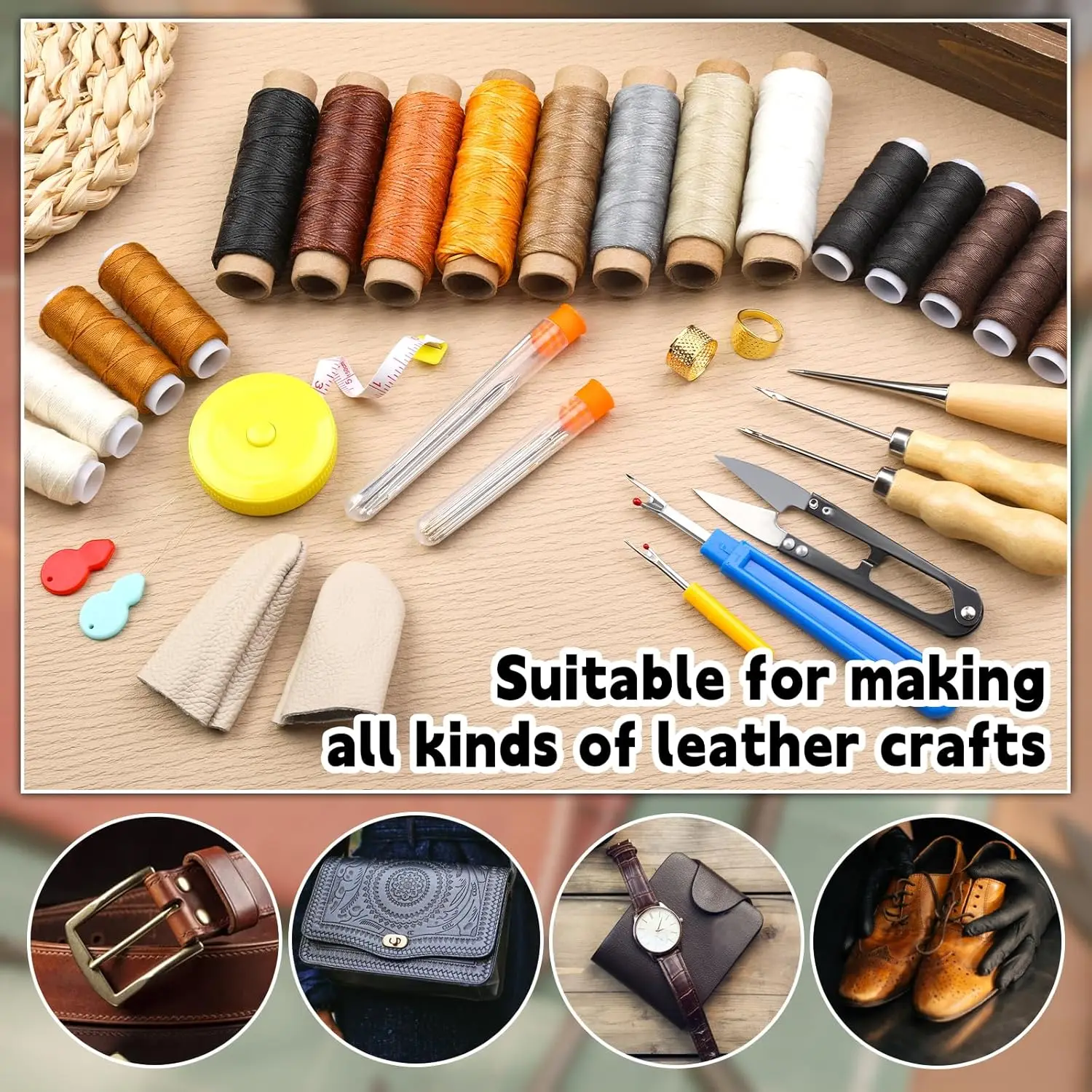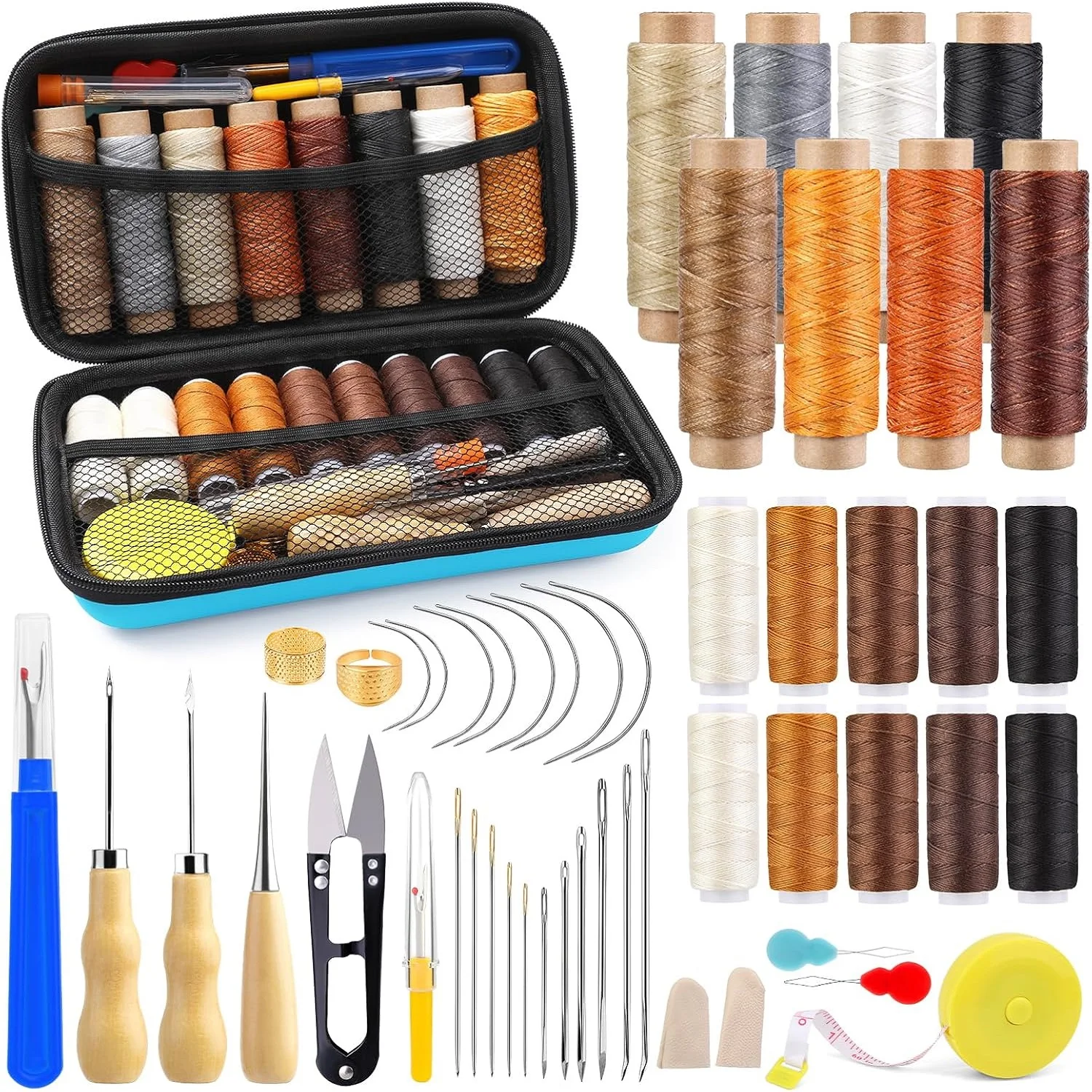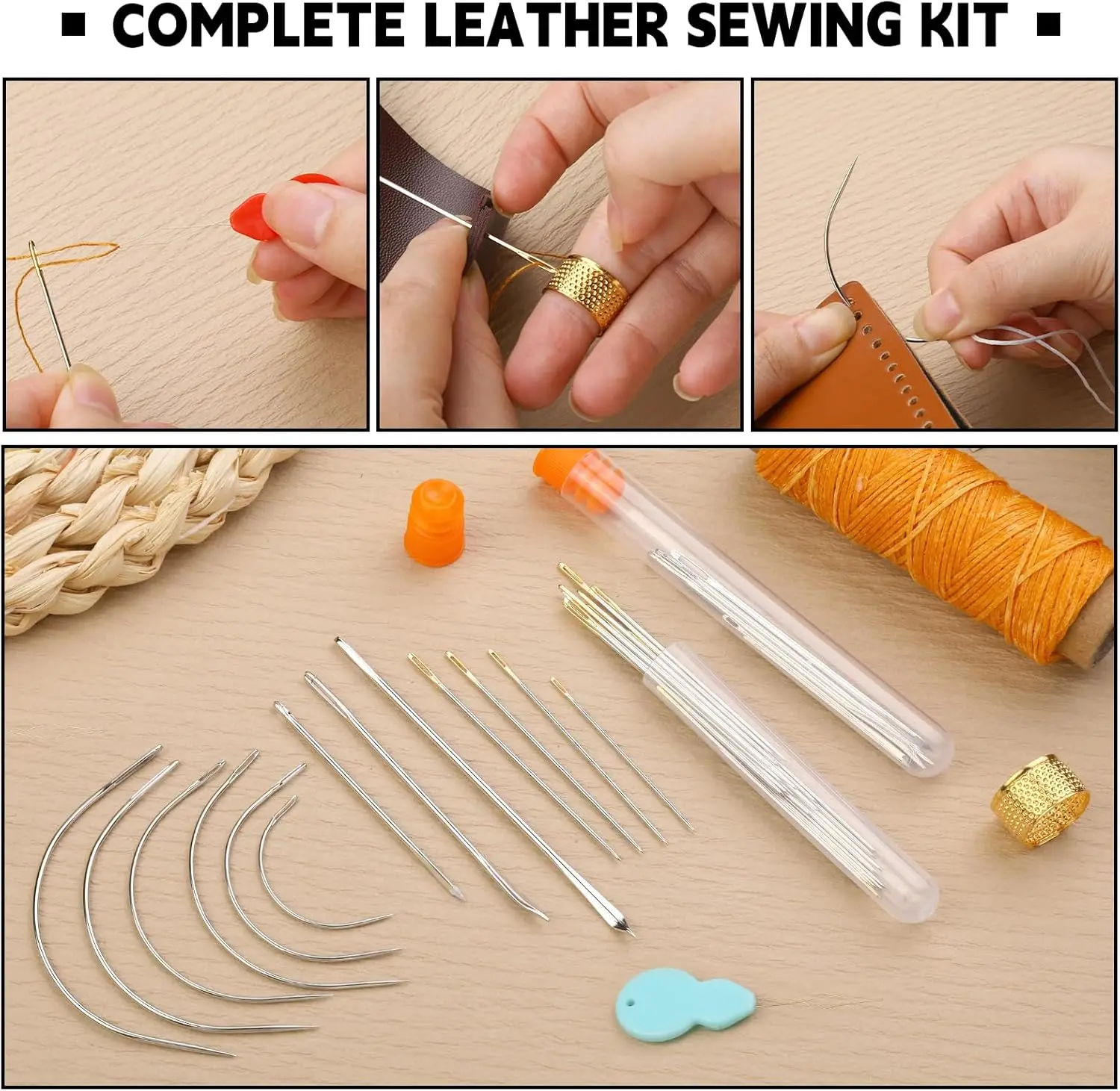 1) KIT PRÁCTICO PARA TRABAJAR EN CUERO: Incluye 8 hilos encerados, 10 hilos para tapicería, 25 agujas de coser a mano con punta, 8 agujas de coser resistentes, 8 agujas curvas, 3 punzones, 2 descosedores, una cinta métrica, una tijera, 2 dedales, 2 enhebradores y un par de dediles. Este kit de costura resistente es muy práctico para sus diversas necesidades de costura y remiendo.