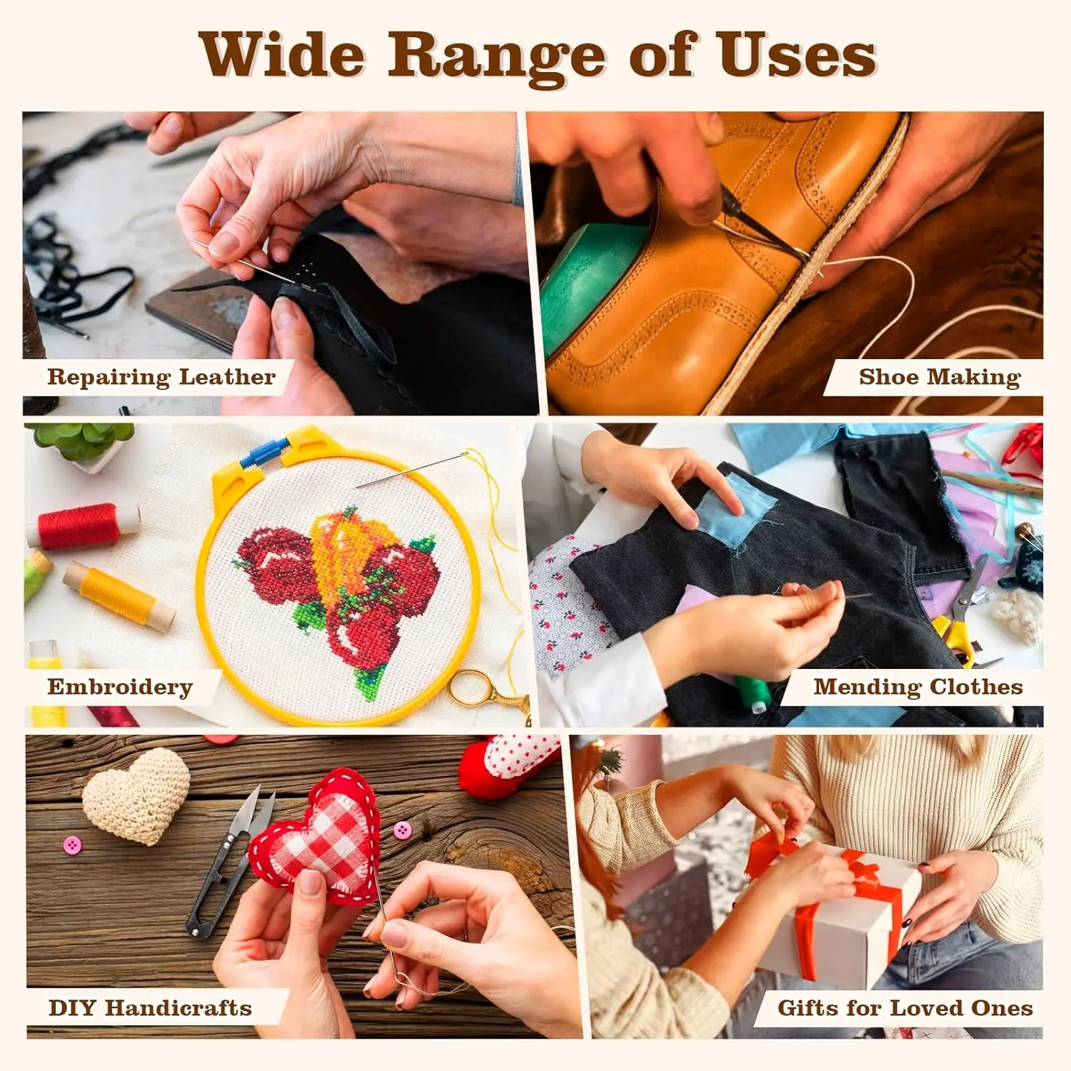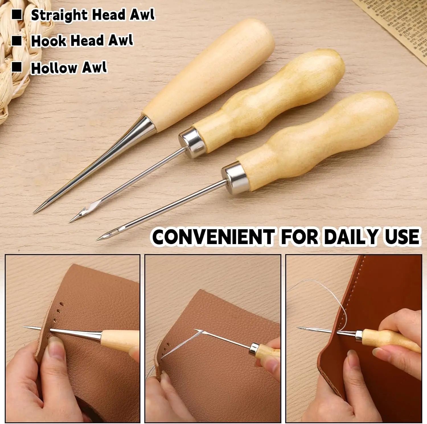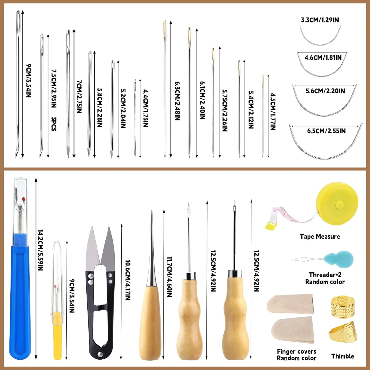 1) KIT PRÁCTICO PARA TRABAJAR EN CUERO: Incluye 8 hilos encerados, 10 hilos para tapicería, 25 agujas de coser a mano con punta, 8 agujas de coser resistentes, 8 agujas curvas, 3 punzones, 2 descosedores, una cinta métrica, una tijera, 2 dedales, 2 enhebradores y un par de dediles. Este kit de costura resistente es muy práctico para sus diversas necesidades de costura y remiendo.
