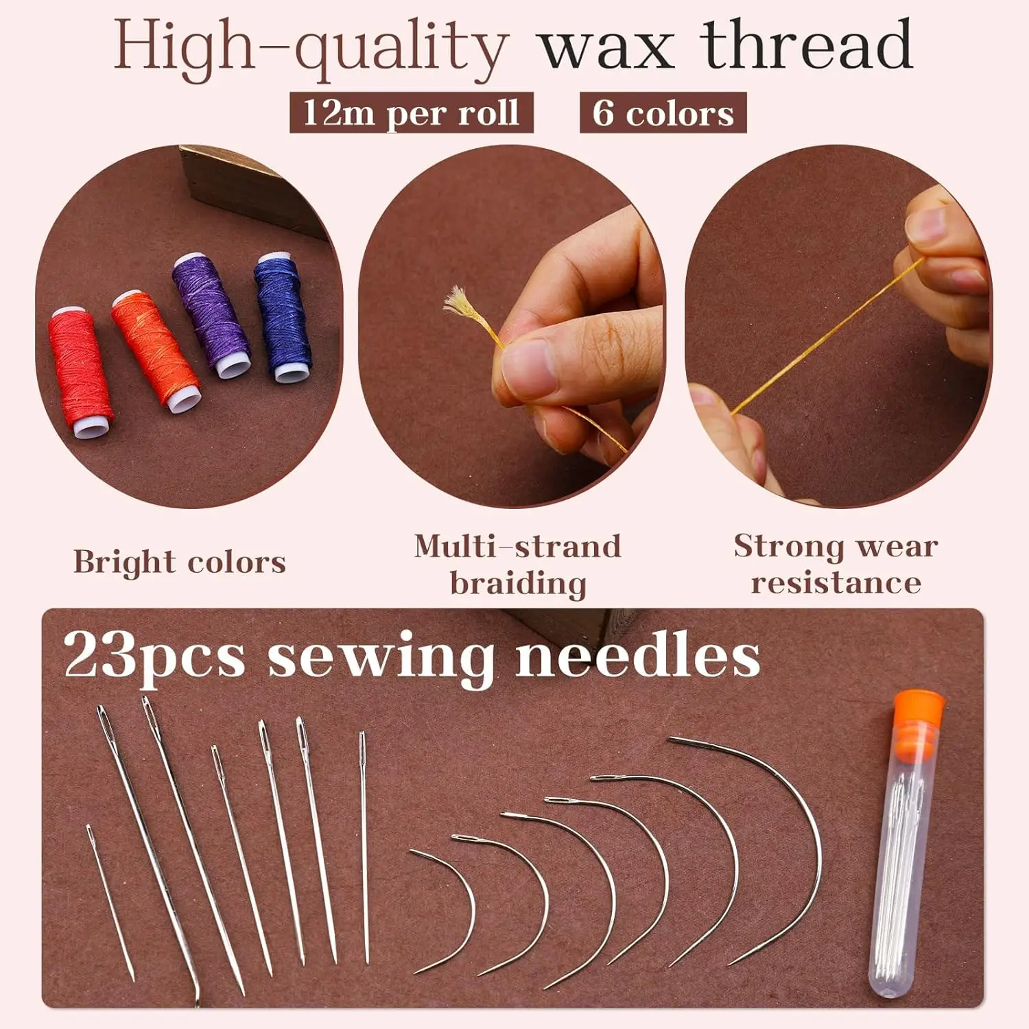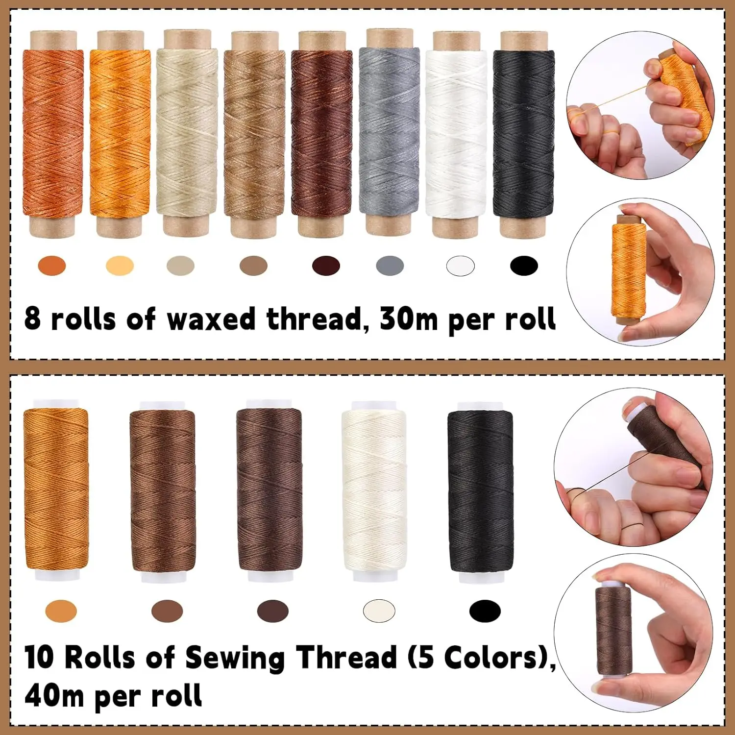 2) HILO DE COSER DE ALTA CALIDAD: El kit de aguja e hilo contiene 8 rollos de hilo encerado y 10 rollos de hilo de coser. El hilo encerado tiene 30 metros por rollo en 8 colores diferentes. El hilo de coser tiene 40 metros por rollo, 5 colores, 2 rollos de cada color. Estos hilos de coser hechos a mano se seleccionan cuidadosamente por sus colores populares y versátiles, así como por su resistencia y durabilidad, ideales para cuero, lona, mezclilla y muchas otras telas, lo que hará que tus manualidades de costura sean más hermosas y duraderas.