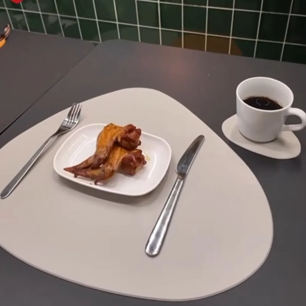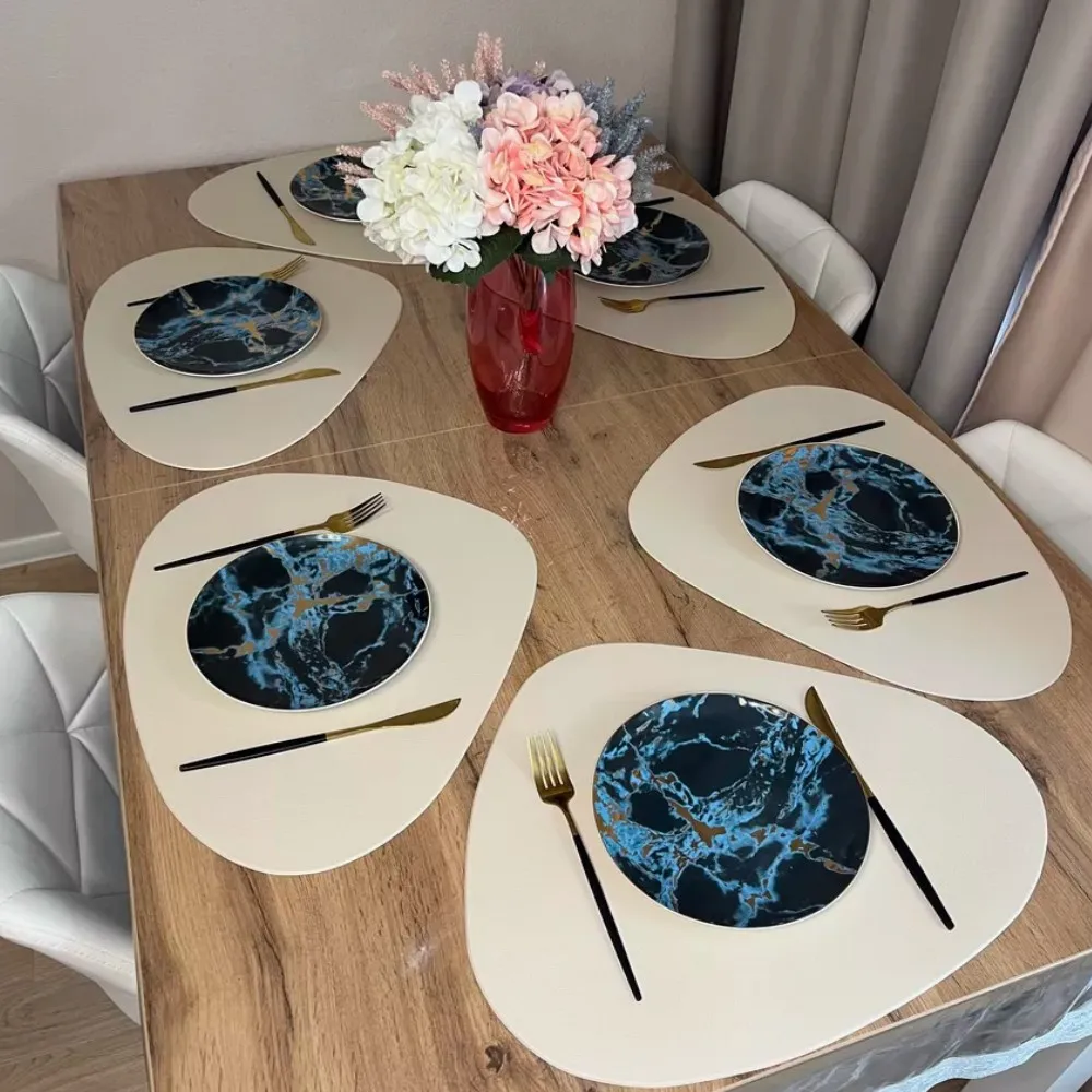 Dieses orangefarbene Tischset- und Untersetzer-Set aus PU-Leder Bringt frische Farbe und modernes Design auf Ihren Tisch. Die unregelmäßige Form im amerikanischen Stil macht jedes Gedeck zu einem echten Blickfang: ideal para Küche, Esszimmer, Café o Coffee Shop. Gleichzeitig schützt das Set Ihre Tischoberflächen zuverlässig vor Flecken, Hitze und Kratzern.