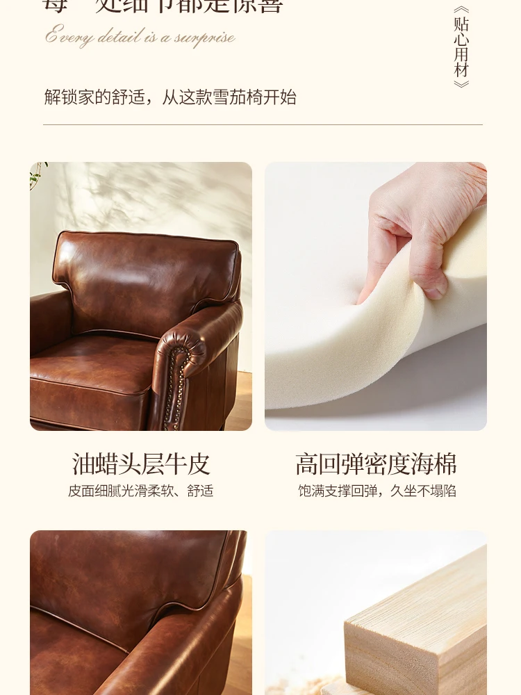 Der Bezug besteht aus hochwertigem Echtleder mit Oil-Wax-Finish . Esta iluminación especial está diseñada para una sensación táctil natural, una luz suave y suave y una estructura maravillosa. Mit der Zeit entwickelt das Leder eine individuelle Patina , die den Sessel noch charaktervoller und einzigartiger macht.