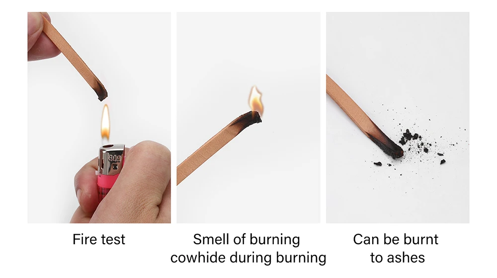 El olor del cuero de vaca genuino después de quemarse es similar al del cabello, y no forma grumos después de quemarse y se puede triturar en polvo; el cuero artificial emitirá un olor acre después de quemarse y formará grumos después de quemarse.