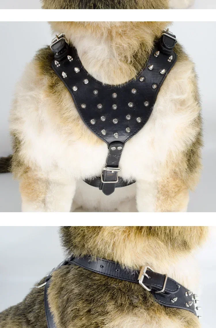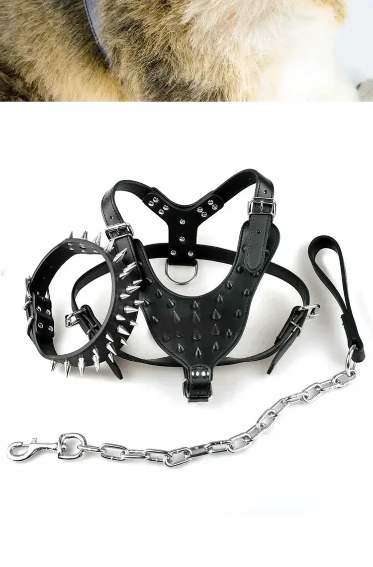 Ensemble de 3 pièces en cuir pour chien avec pointes – Harnais, sangles et laisse réglables au design punk pour l'entraînement et le spa