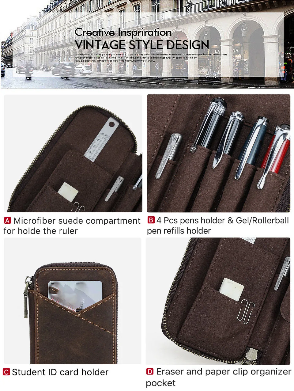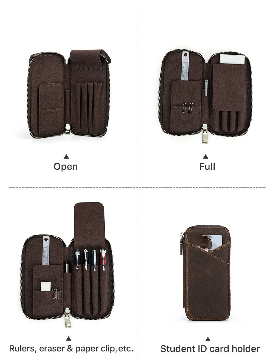 Entscheiden Sie sich für ein hochwertiges Leder Federmäppchen mit 4 Fächern , das Ordnung, Schutz et zeitlose Eleganz perfekt vereint. Un zuverlässiger begleiter für alle, die Wert auf Qualität and Stil legen.