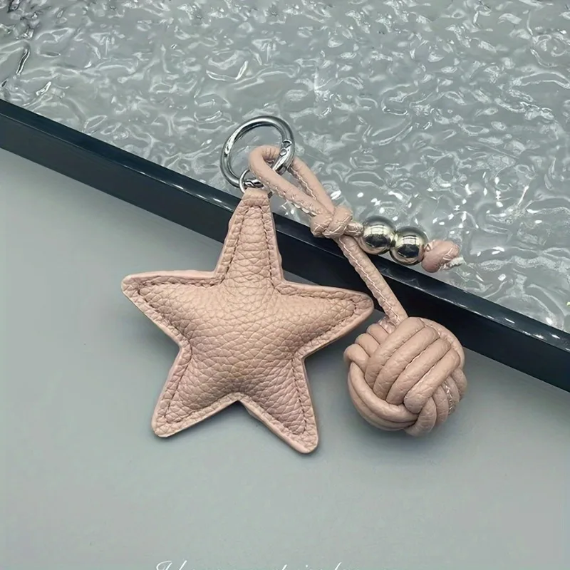 Fünfzackiger Stern Schlüsselanhänger aus Leder – Creativer Keyring mit geflochtener Lederkugel, stilvoller Taschen- & Autoschmuck