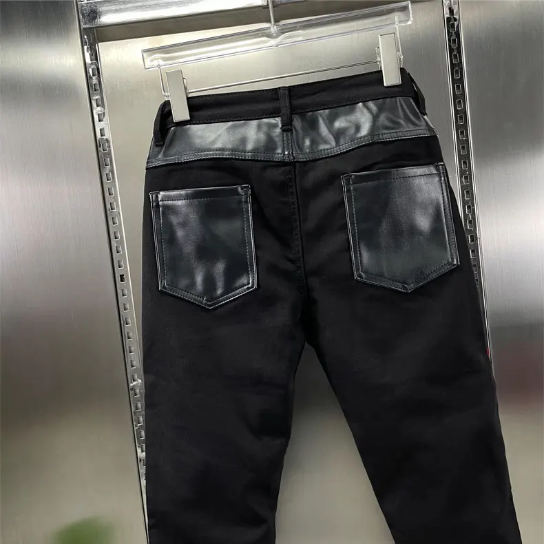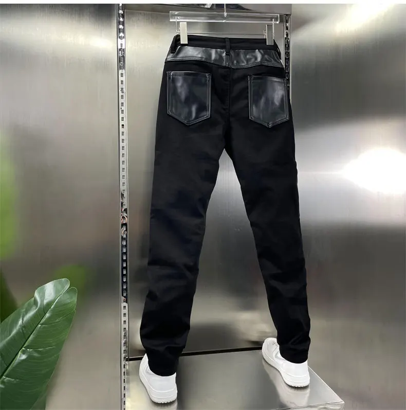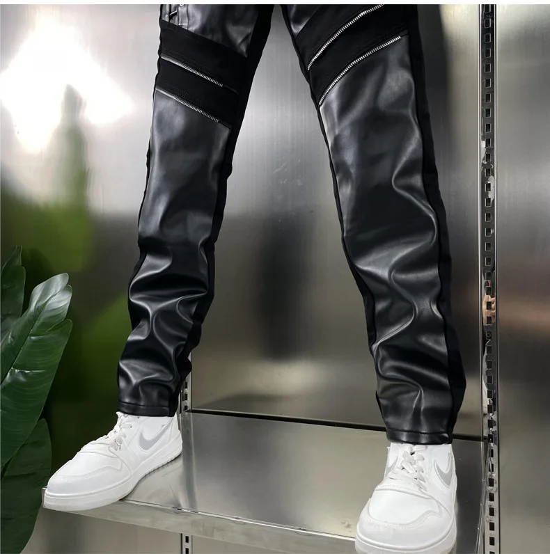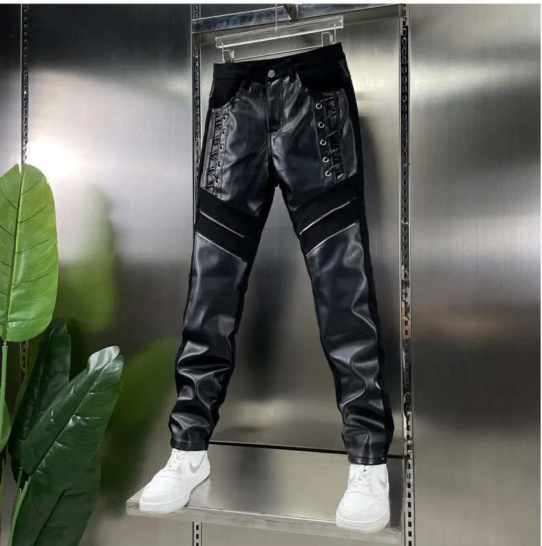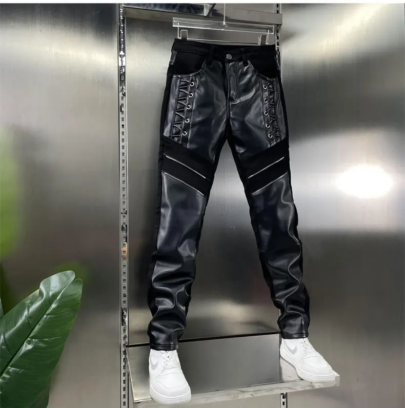 Pantalon en cuir PU Slim Fit pour hommes – Tuyau de motard coupe-vent avec design patchwork et fermeture à glissière, pantalon de moto moderne pour le sport et l'herbe