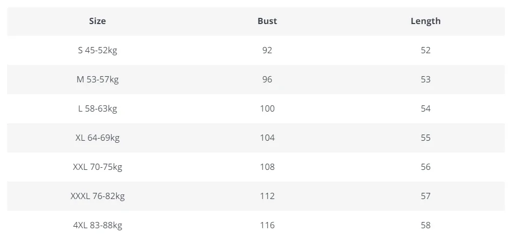 3. Toutes les mesures ci-dessus correspondent aux dimensions réelles du vêtement. Pour un ajustement optimal, veuillez ajouter 8 à 10 cm à votre tour de poitrine lors du choix de votre taille dans le tableau ci-dessus.