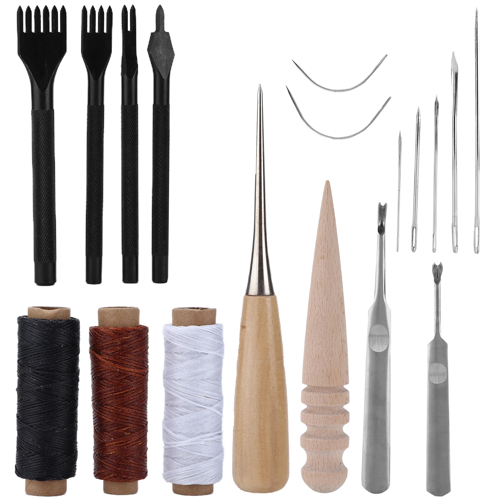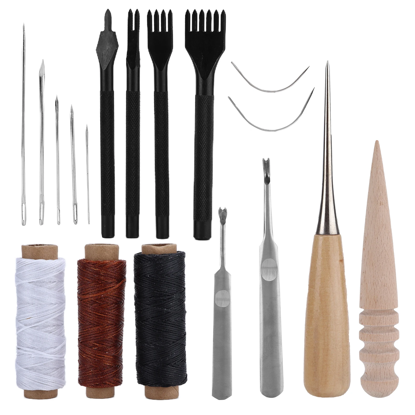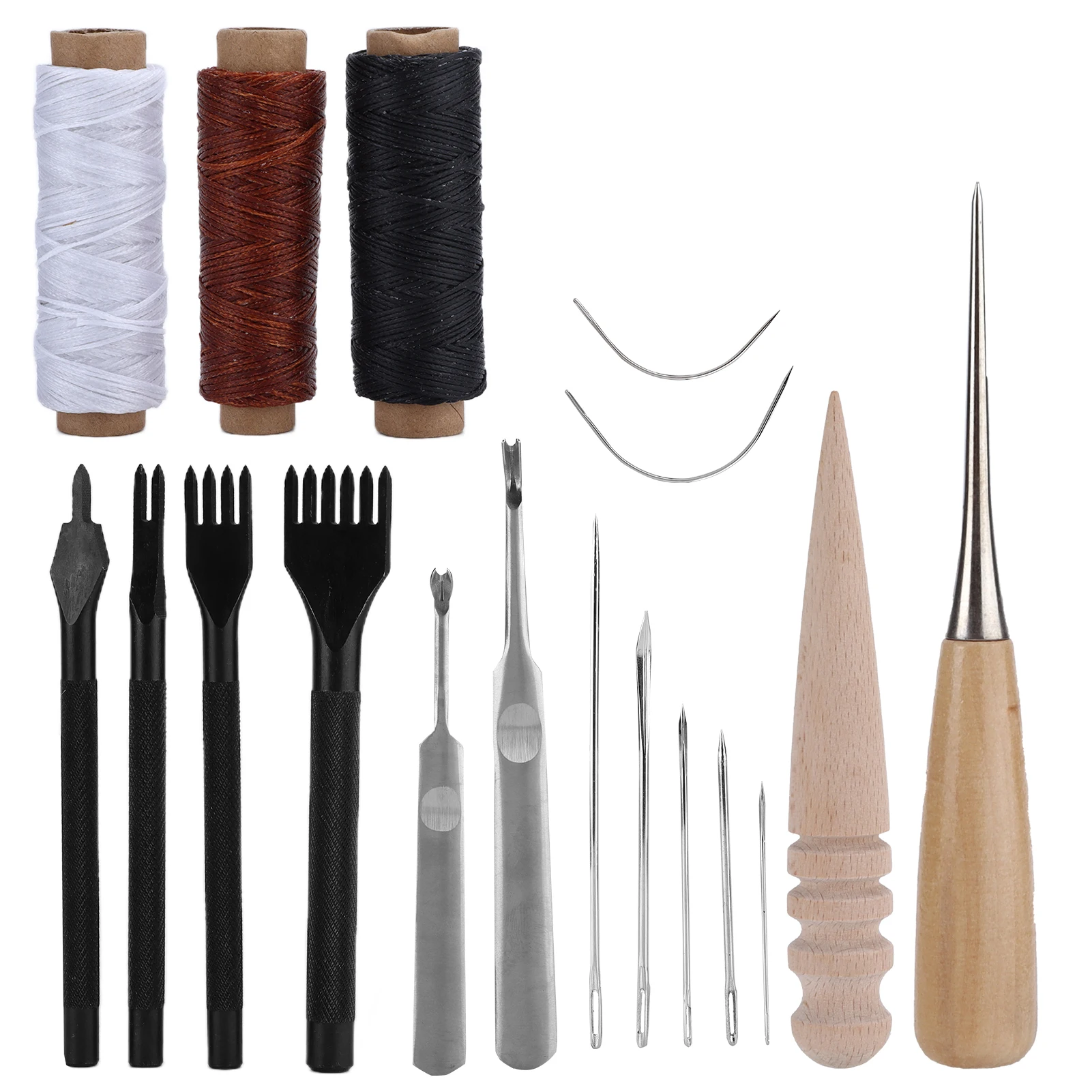 Die Werkzeuge bestehen aus einer langlebigen Kombination aus Edelstahl, Eisen, kohlenstoffreichem Stahl, Holz und gewachstem Faden. Der Wachsfaden sorgt für gleichmäßige, feste Stiche und gleitet leicht durch Leder und Stoff. Der Fingerhut schützt Ihre Finger und erhöht den Arbeitskomfort.