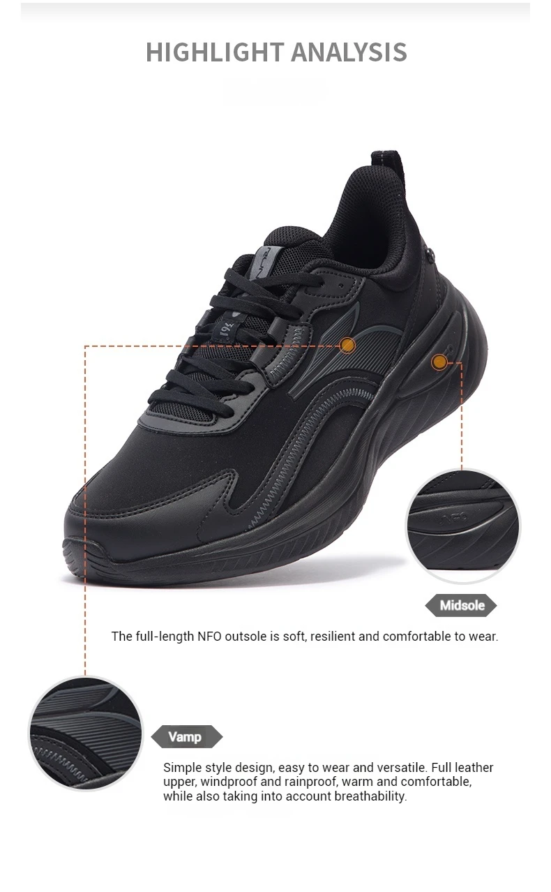 Das Obermaterial aus Leder ist robust, atmungsaktiv und passt sich dem Fuß an, während die EVA-Dämpfung Stöße absorbiert und für hohen Komfort sorgt. Die Gummiaußensohle bietet rutschfesten Halt auf harten Untergründen, wodurch die Schuhe auch für Outdoor-Läufe auf Asphalt geeignet sind.