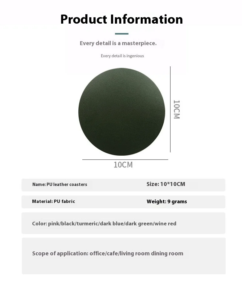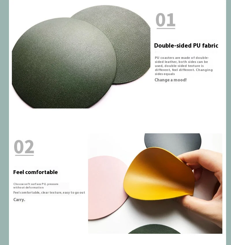 Die Untersetzer bestehen aus strapazierfähigem Kunstleder (Polyesterbasis), das sich angenehm anfühlt und für den täglichen Gebrauch konzipiert ist. Das Material ist umweltfreundlich, frei von bedenklichen Chemikalien und besonders formstabil. Auch bei häufiger Nutzung behalten die Untersetzer ihre glatte Oberfläche und gepflegte Optik.