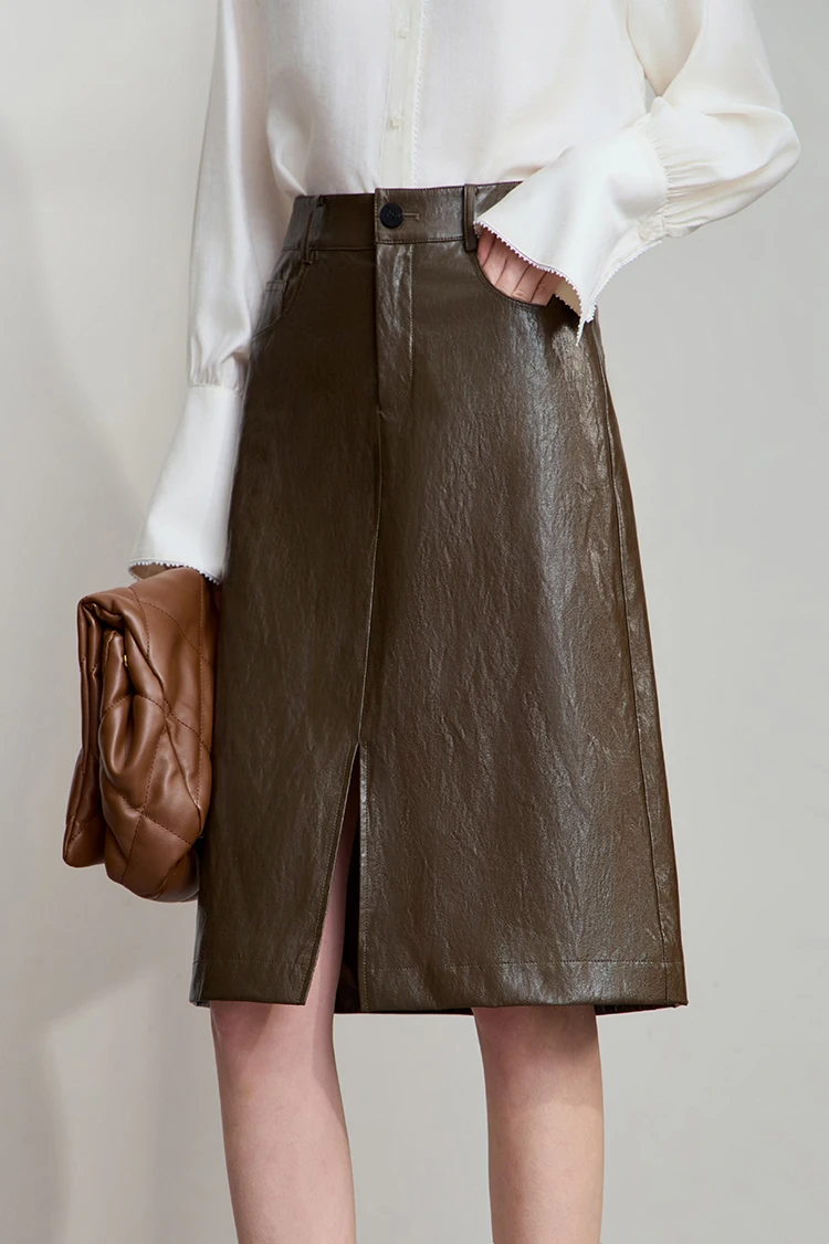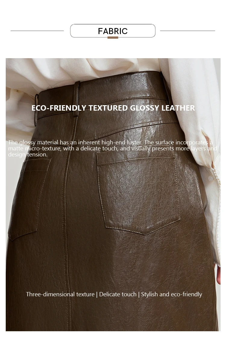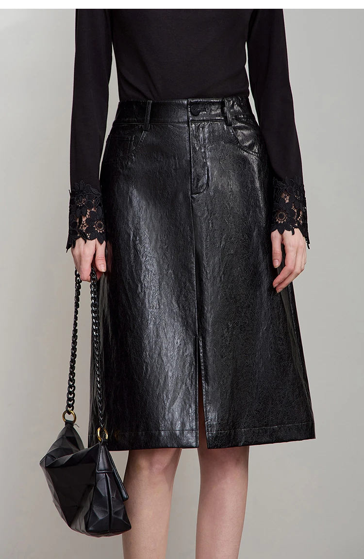 AMII Damen PU Leder Rock – Minimalistischer Knielanger Business-Rock im American Retro Stil, eleganter Office-Rock Herbst/Winter 2025