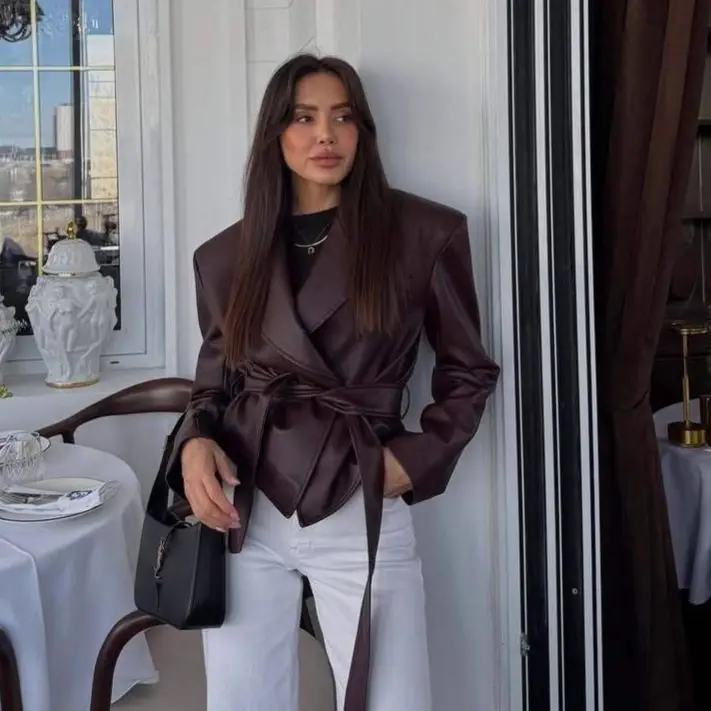 Setzen Sie ein modisches Statement mit dieser Damen Faux Leather Jacke mit Gürtel und bringen Sie Coolness und Eleganz perfekt in Einklang. Ideal für selbstbewusste Frauen mit Sinn für Stil. Jetzt bestellen und stark auftreten!
