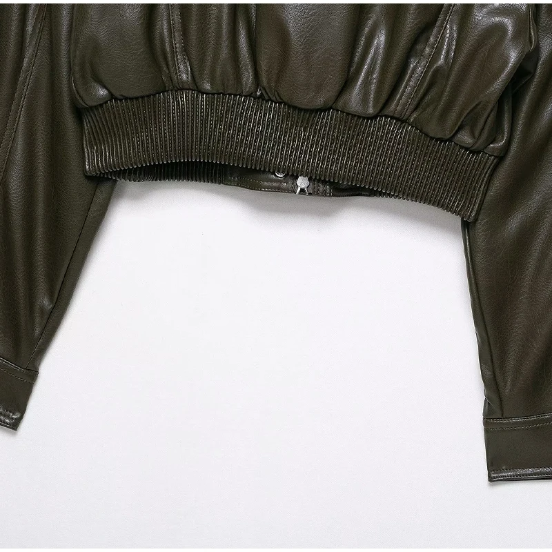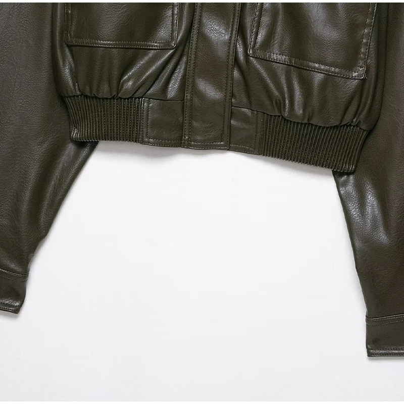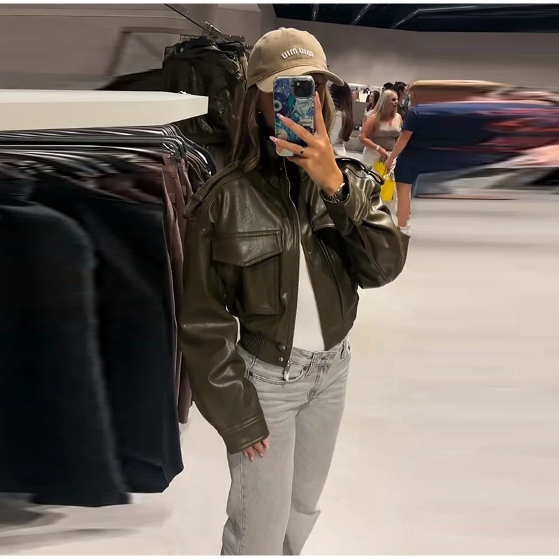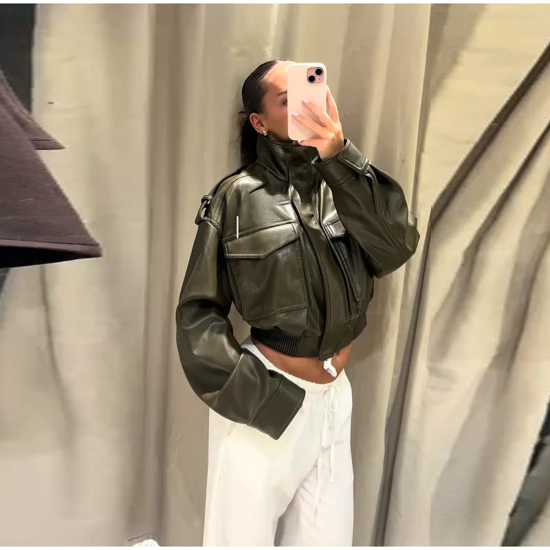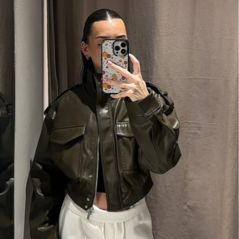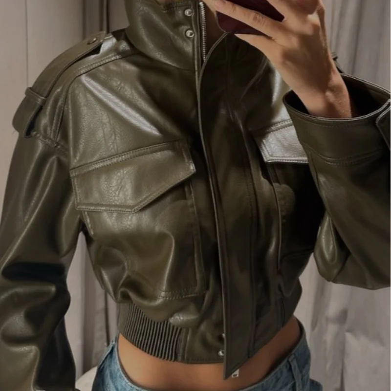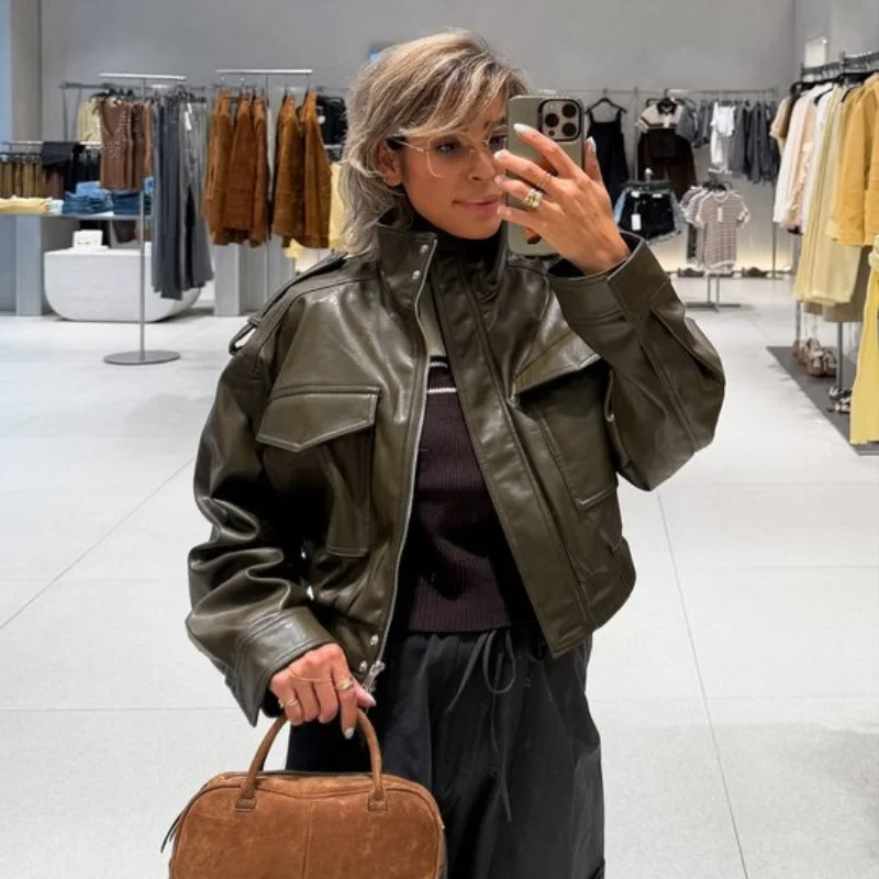 Damen Cropped Kunstleder Jacke Vintage Streetwear 2025 – Kurze High-Street Lederoptik Jacke mit Taschen & Reißverschluss, Herbst/Winter Outwear