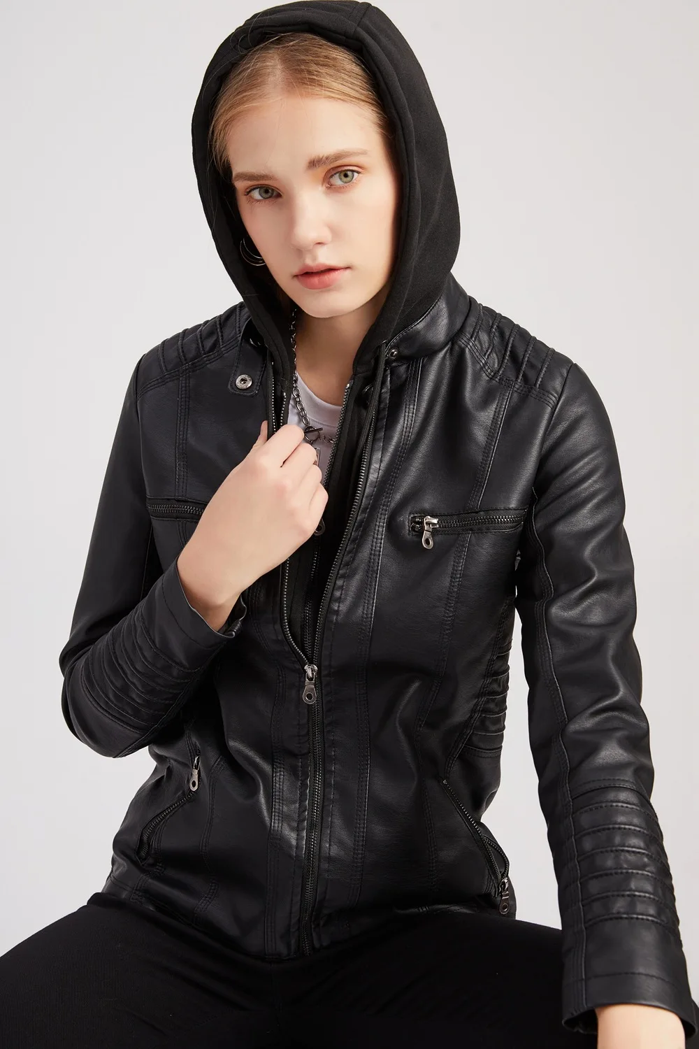 Diese Damen PU Lederjacke im Motorrad-Stil vereint kraftvolles Design, hohen Tragekomfort und moderne Funktionalität. Mit ihrem klassischen schwarzen Look, der markanten Biker-Optik und der praktischen Kapuze ist sie ein vielseitiges Must-have für die kälteren Jahreszeiten. Ideal für Herbst und Winter – stilvoll, lässig und selbstbewusst.