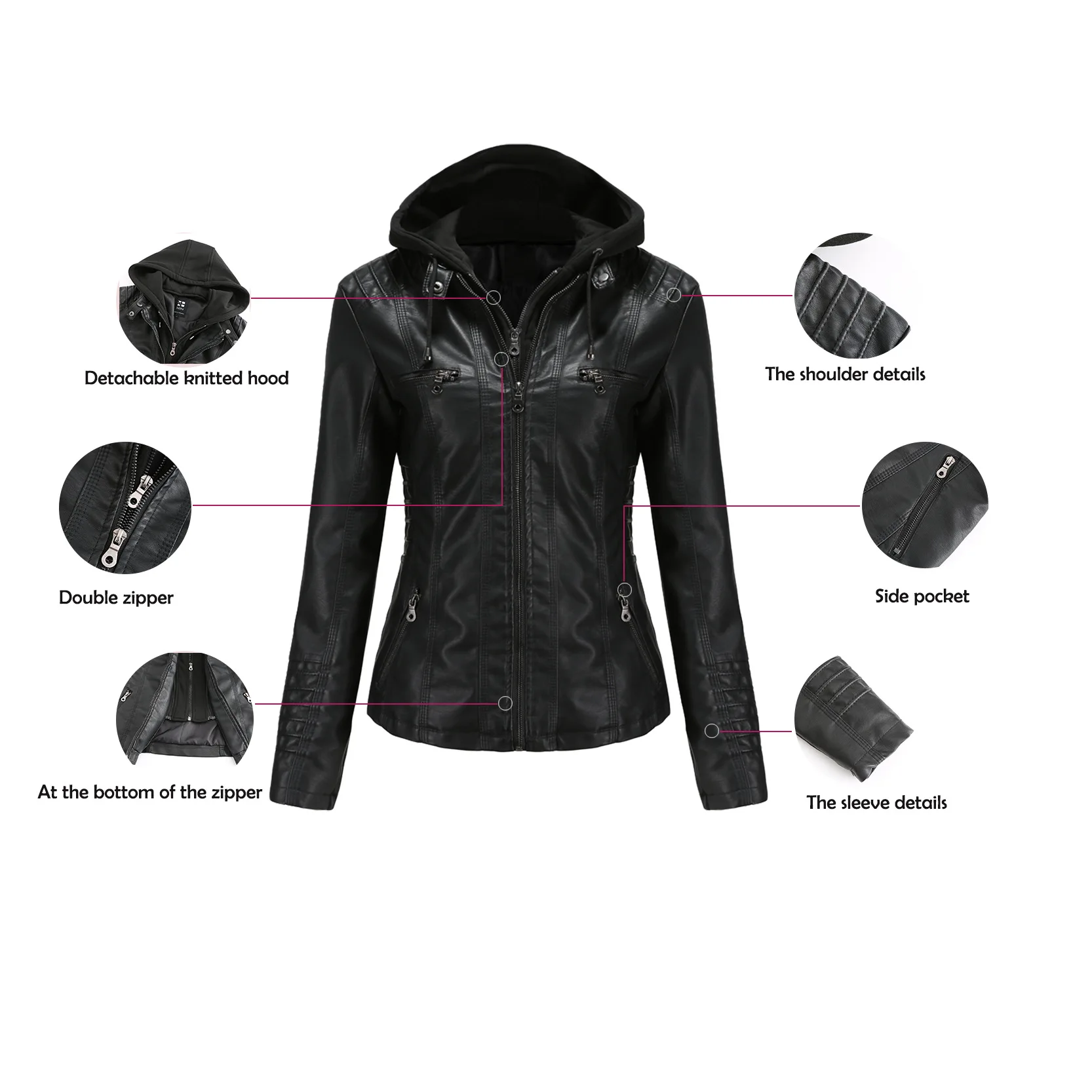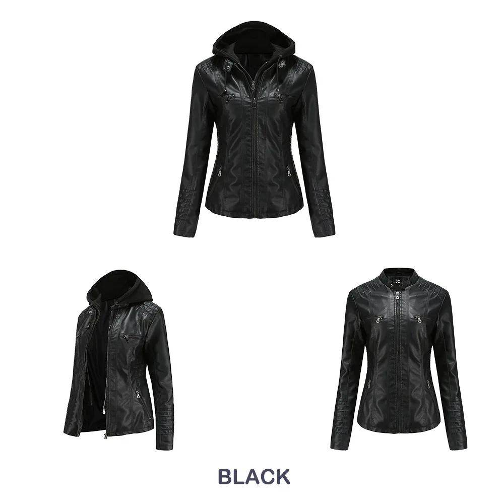 Damen PU Motorrad-Lederjacke mit Kapuze – Schwarze Biker Jacke aus Faux Leather, Herbst & Winter Mantel für Frauen XS–7XL