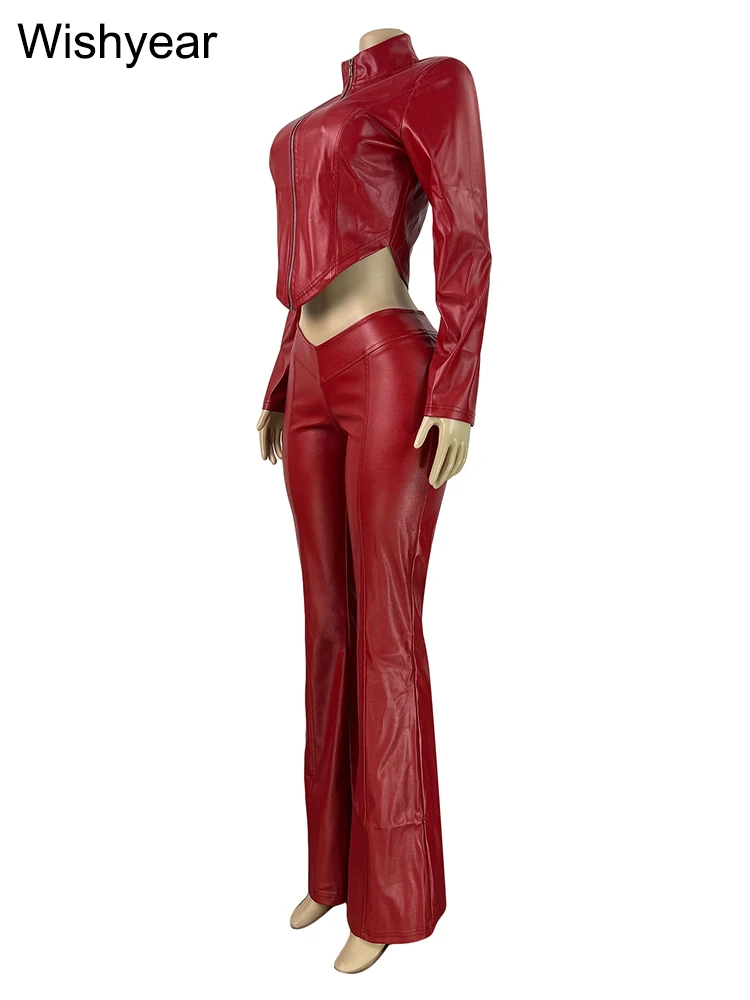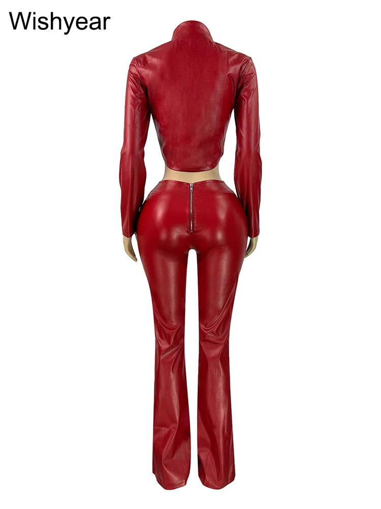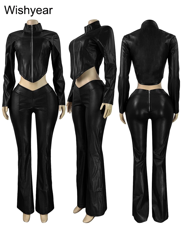Damen Streetwear PU-Leder Set – Langärmeliges Crop Top mit Reißverschluss & High-Waist Schlaghose im Moto-Biker-Stil