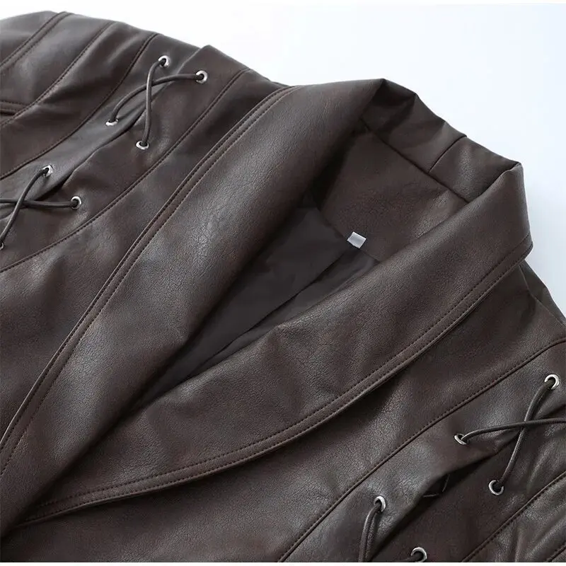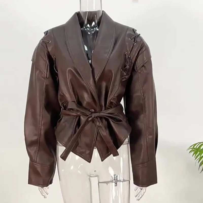 Damen Vintage Lederjacke Braun – Kurzjacke mit Reverskragen, Schulterpolstern & Gürtel, High-Waist Herbstmode 2025
