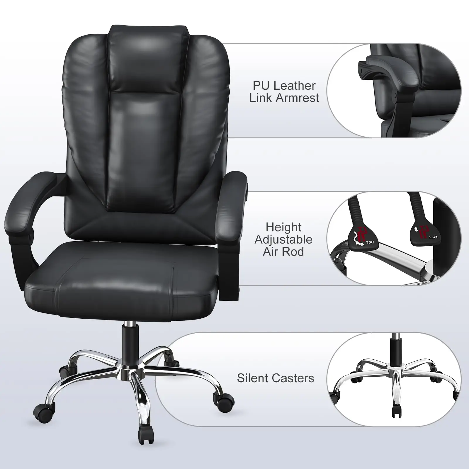 Description:PU Leather Link Armrest - Height Adius stable Air Rod - Silent Casters