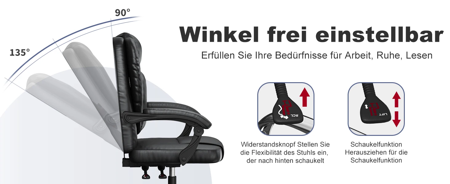 Die hohe, gepolsterte Rückenlehne unterstützt den gesamten Rückenbereich und fördert eine gesunde Sitzhaltung. Dank der Neigefunktion bis 135° mit Arretierung können Sie entspannt zurücklehnen oder sogar eine kurze Pause einlegen. Die stufenlose Höhenverstellung ermöglicht eine individuelle Anpassung an unterschiedliche Körpergrößen und Schreibtische.