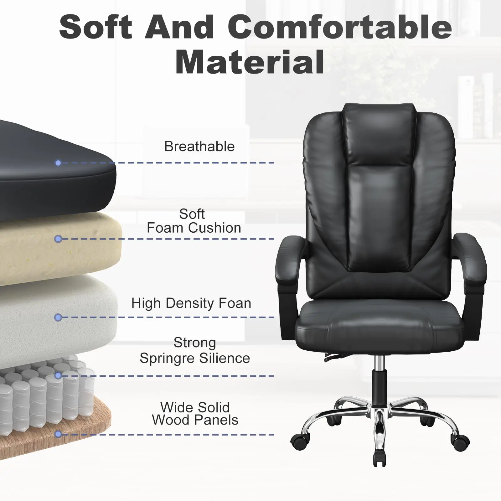 Dieser ergonomische Bürostuhl aus PU-Leder wurde speziell für modernes Arbeiten im Büro oder Home Office entwickelt. Mit seiner hohen Rückenlehne, der flexiblen Verstellbarkeit und dem hochwertigen Federpolster bietet er optimalen Sitzkomfort – selbst bei langen Arbeitstagen. Das zeitlose Executive-Design macht ihn zu einer stilvollen Ergänzung für jedes Arbeitszimmer.
