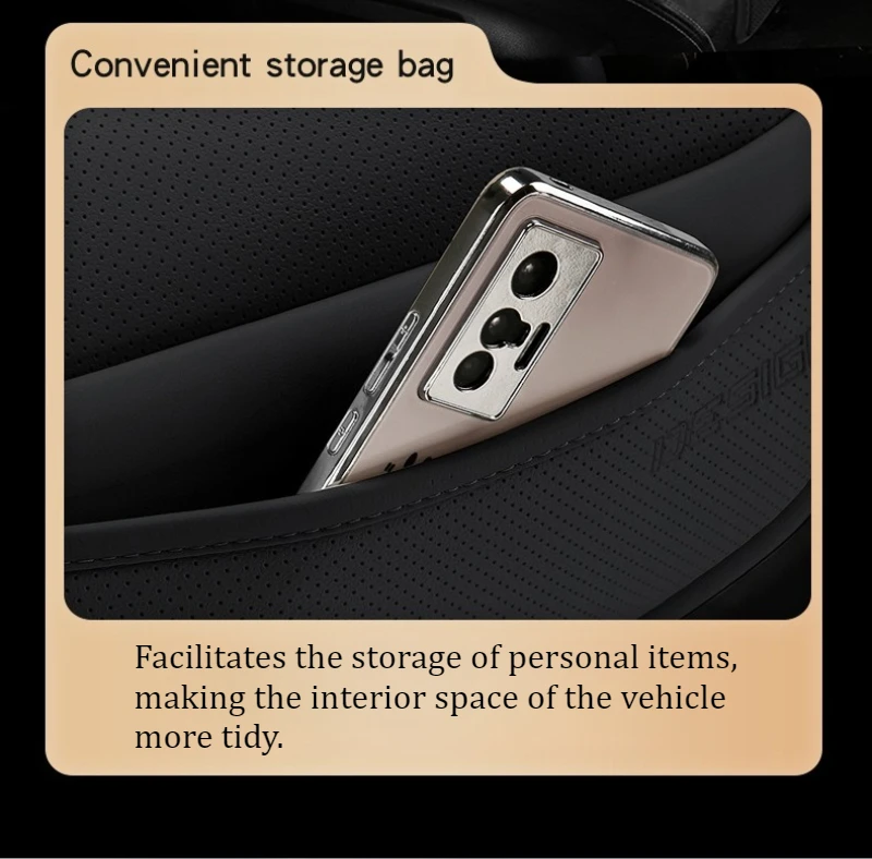 Seitlich integrierte Aufbewahrungstaschen bieten Platz für Smartphone, Schlüssel, Geldbörse oder andere Kleinigkeiten. So haben Sie wichtige Dinge stets griffbereit, ohne zusätzliche Ordnungssysteme im Fahrzeug zu benötigen.