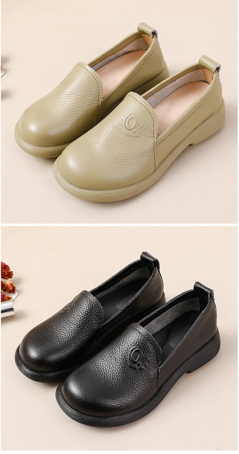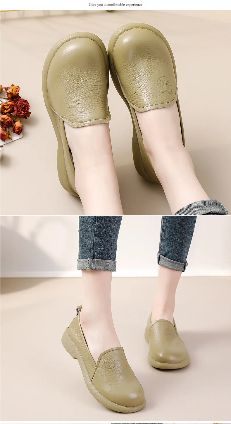feerldi Damen Leder Flats WB-308K – Retro Slip-On Loafers, Weiche, Anti-Rutsch Mokassins, Elegante grüne Flats für Alltag & Büro