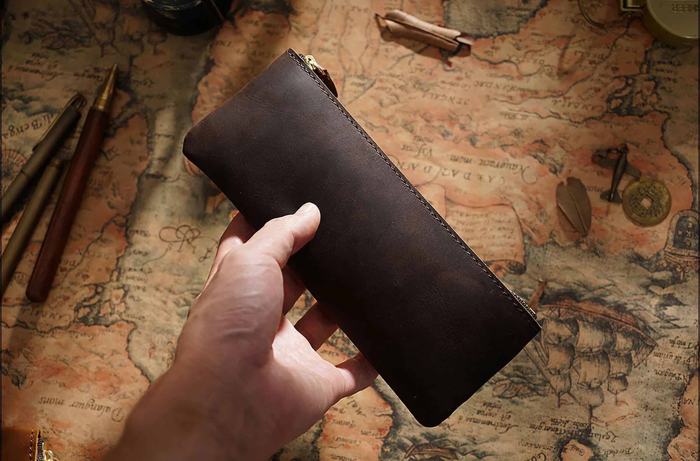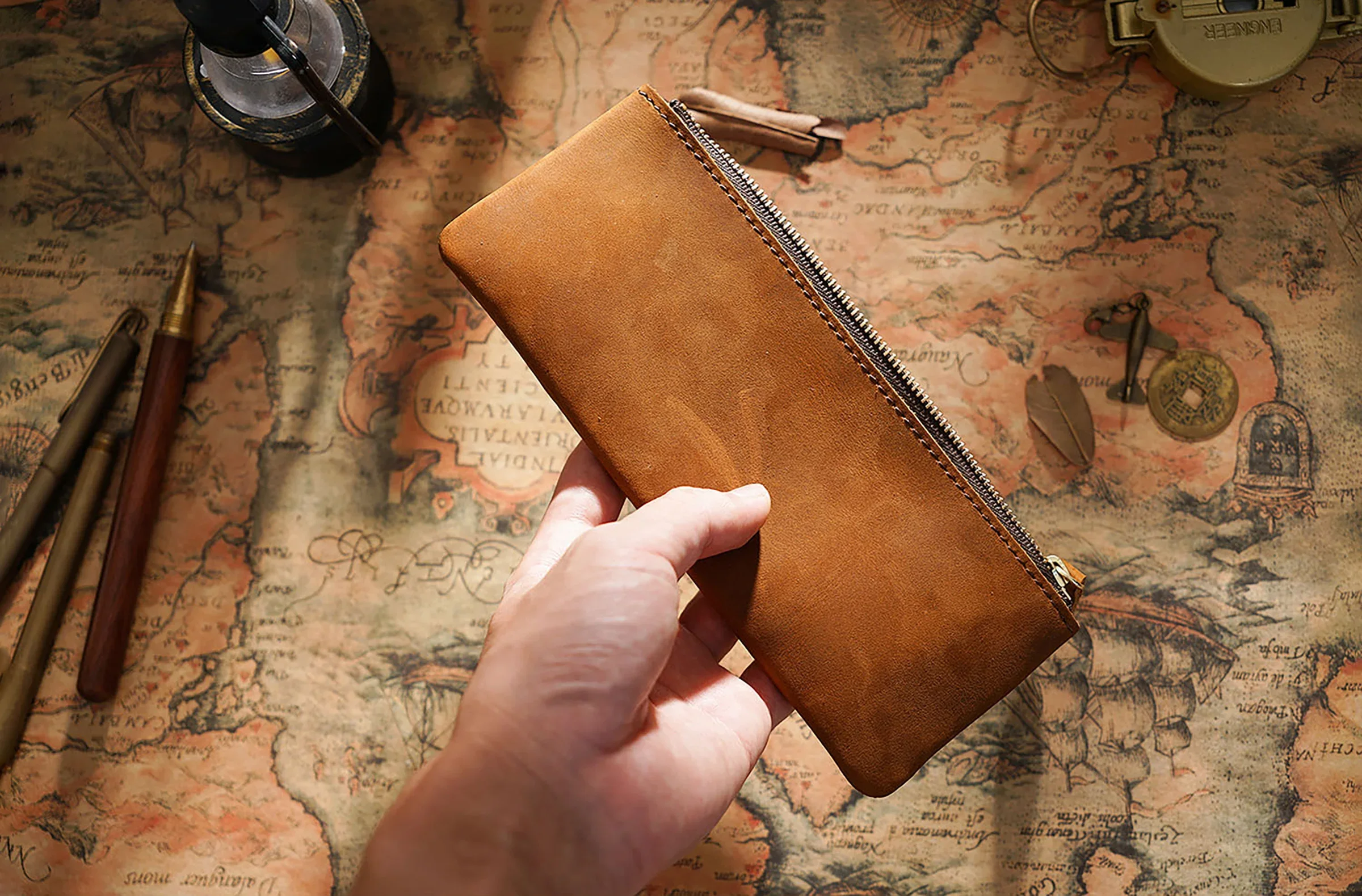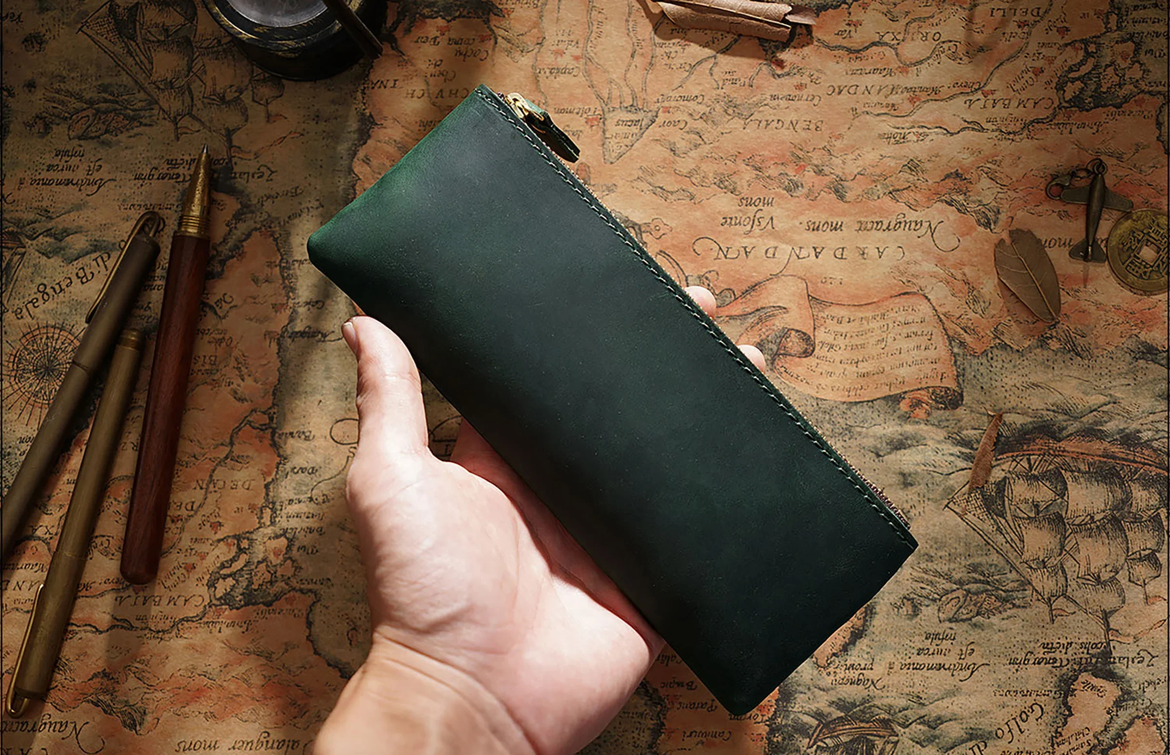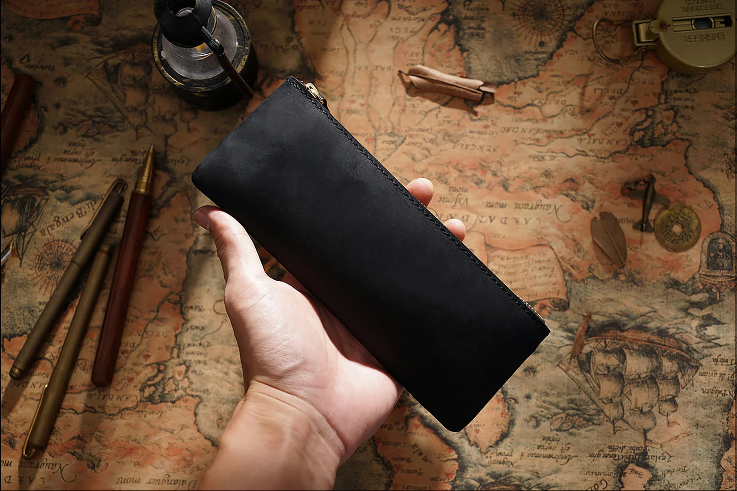 Dieses handgefertigte Leder Stifteetui mit Reißverschluss verbindet zeitloses Vintage-Design mit praktischer Funktionalität. Als hochwertiger Stationery Organizer eignet es sich ideal für Büro, Schule und Reisen. Ob Füllfederhalter, Kugelschreiber oder weiteres Schreibzubehör – alles ist sicher, ordentlich und stilvoll verstaut.