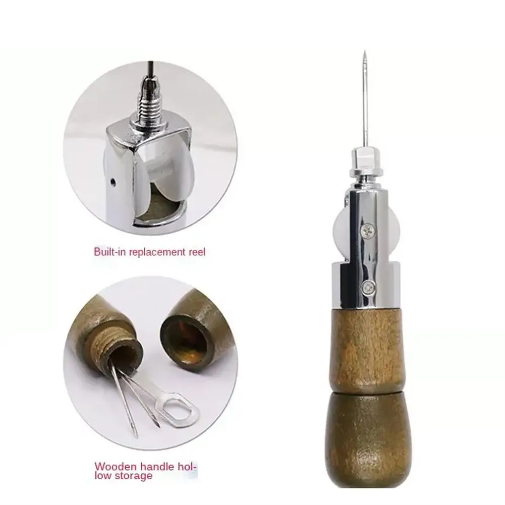 Der Griff aus massivem Holz liegt angenehm in der Hand und sorgt für eine sichere, ermüdungsfreie Führung. Die abgerundete Oberfläche unterstützt eine präzise Kontrolle beim Nähen. Besonders praktisch: Der Griff lässt sich am Ende aufdrehen und dient als integriertes Aufbewahrungsfach für Nadeln und Zubehör – alles griffbereit in einem kompakten Werkzeug.