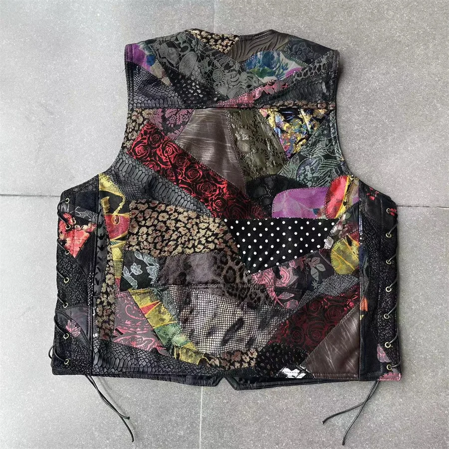 Ein besonderes Highlight ist das dekorative Muster im Animal-Stil, das der Lederweste ihren unverwechselbaren Punk-Charakter verleiht. Die Knopfdetails und die einreihige Front sorgen für eine maskuline Silhouette und einen sicheren Sitz. Der klassische V-Ausschnitt rundet das Design stilvoll ab und macht die Weste vielseitig kombinierbar.