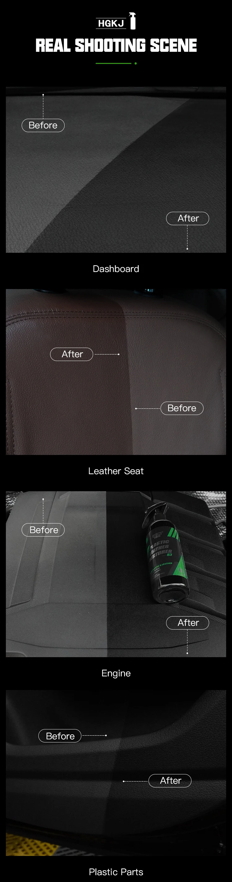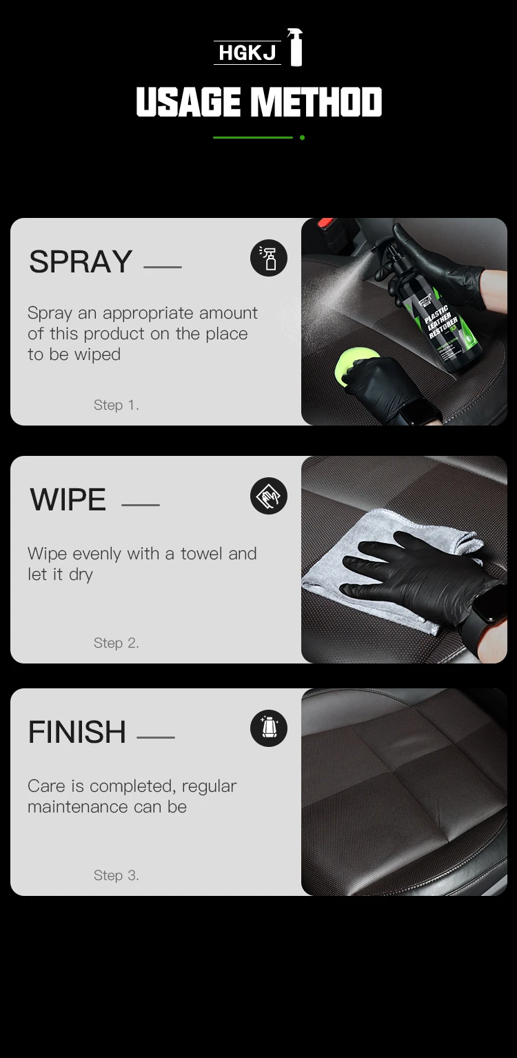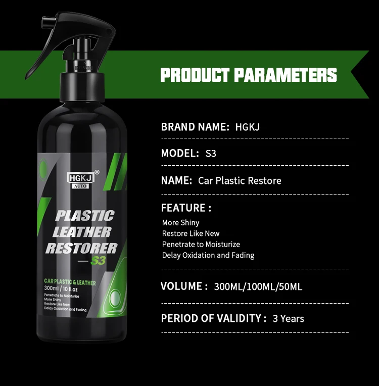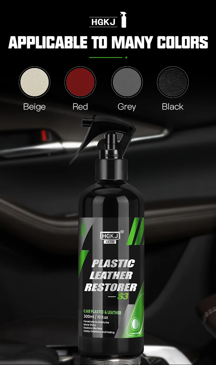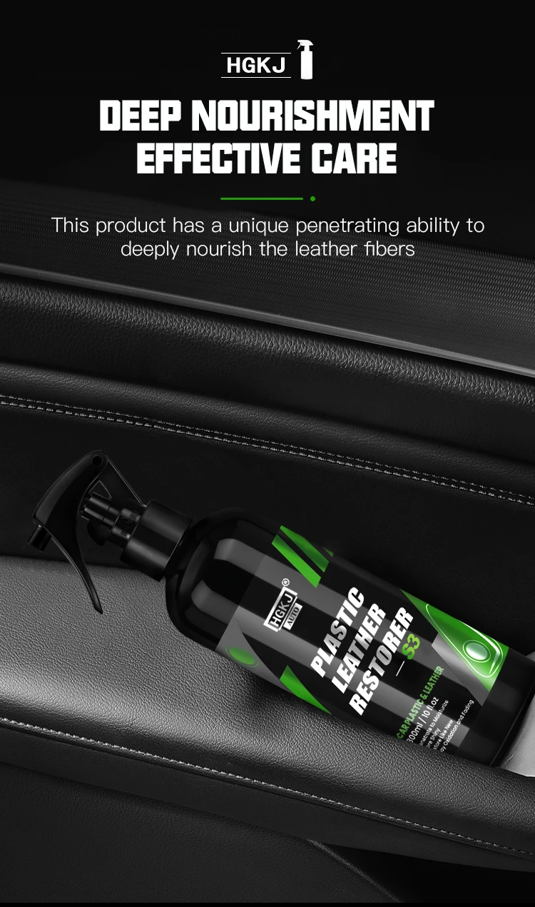 Das HGKJ S3 Car Plastic & Leather Restorer Spray ist ein leistungsstarkes Reinigungs-, Pflege- und Schutzspray, das Kunststoff-, Gummi- und Lederoberflächen Ihres Fahrzeugs wieder in Bestform bringt. Es entfernt mühelos leichte Oxidation, Schmutz, Wachsrückstände und matte Oberflächenfilme und sorgt für einen tiefen, satten Farbton mit frischem Glanz.