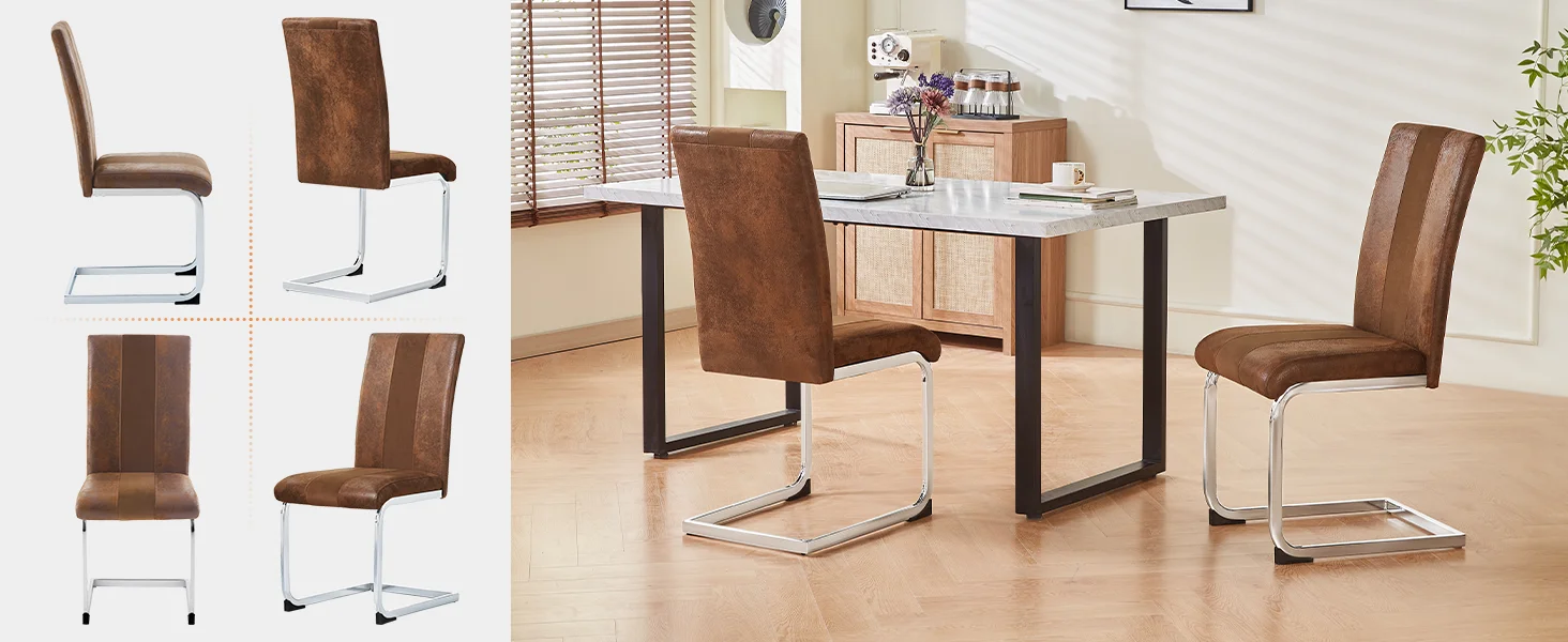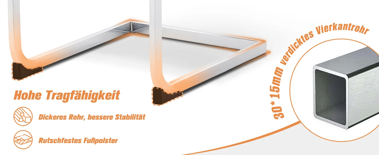 Der robuste, chrombeschichtete Metallrahmen sorgt für hohe Stabilität und Langlebigkeit. Die Freischwinger-Konstruktion bietet ein sanftes Nachgeben beim Sitzen und erhöht den Komfort spürbar. Gleichzeitig verleiht das glänzende Chromfinish den Stühlen eine elegante, moderne Ausstrahlung.