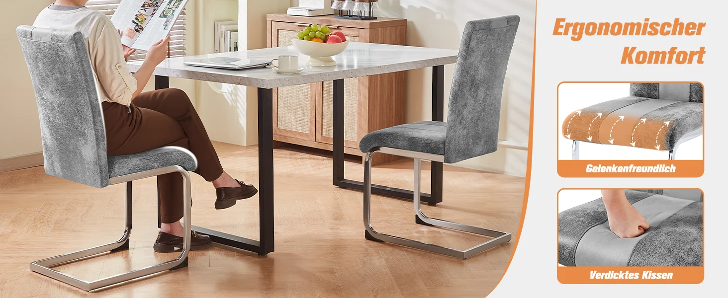 Dieses Set aus 4 Freischwinger-Esszimmerstühlen vereint modernes Design, ergonomischen Sitzkomfort und hochwertige Materialien. Die elegante Schwingkonstruktion mit verchromtem Metallrahmen verleiht Ihrem Essbereich eine leichte, zeitgemäße Optik und sorgt gleichzeitig für angenehme Flexibilität beim Sitzen. Ideal für Esszimmer, Küche oder offene Wohnkonzepte.
