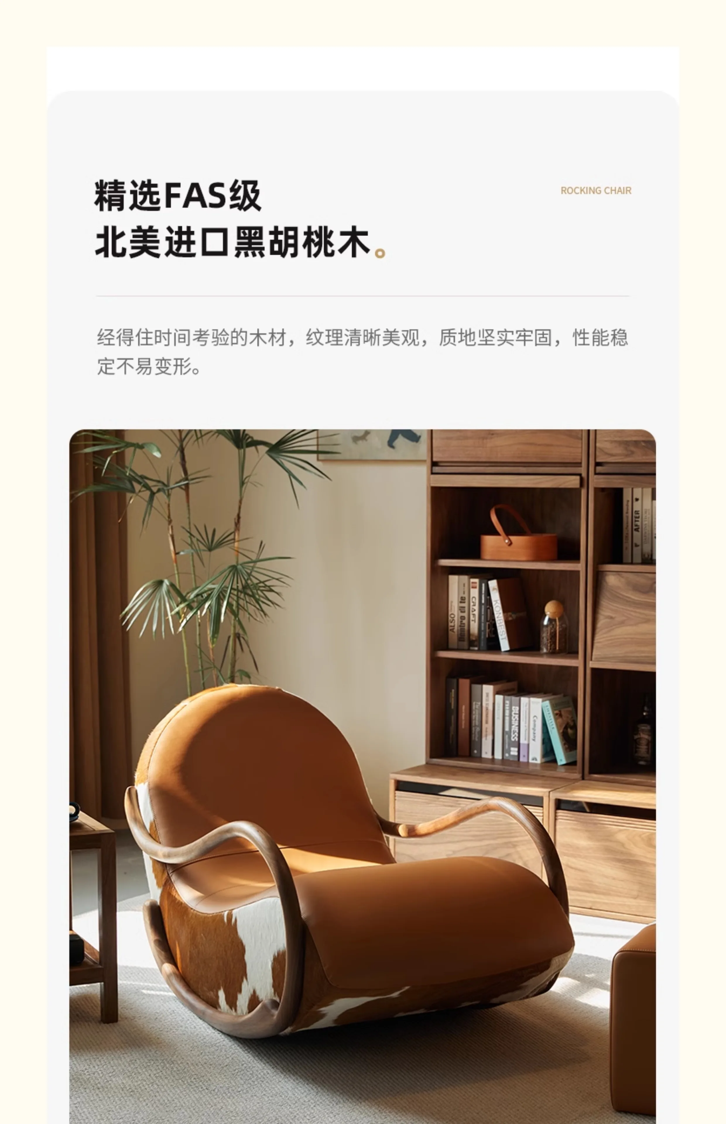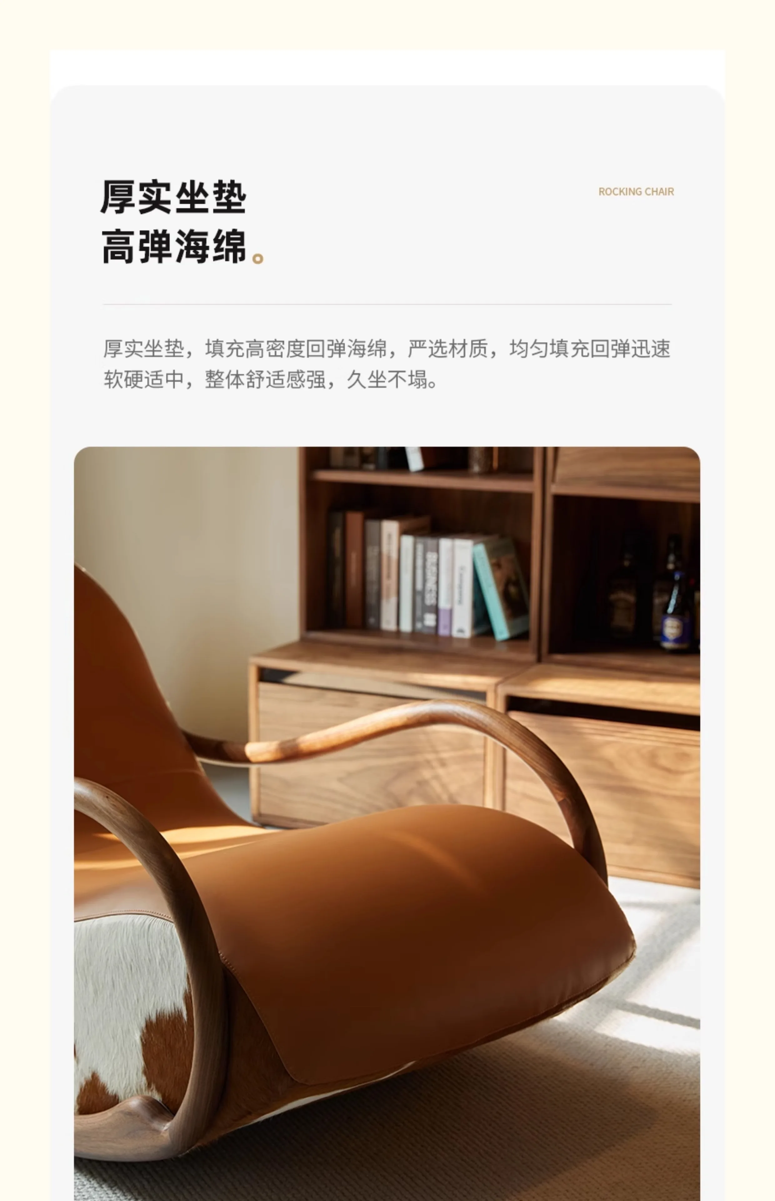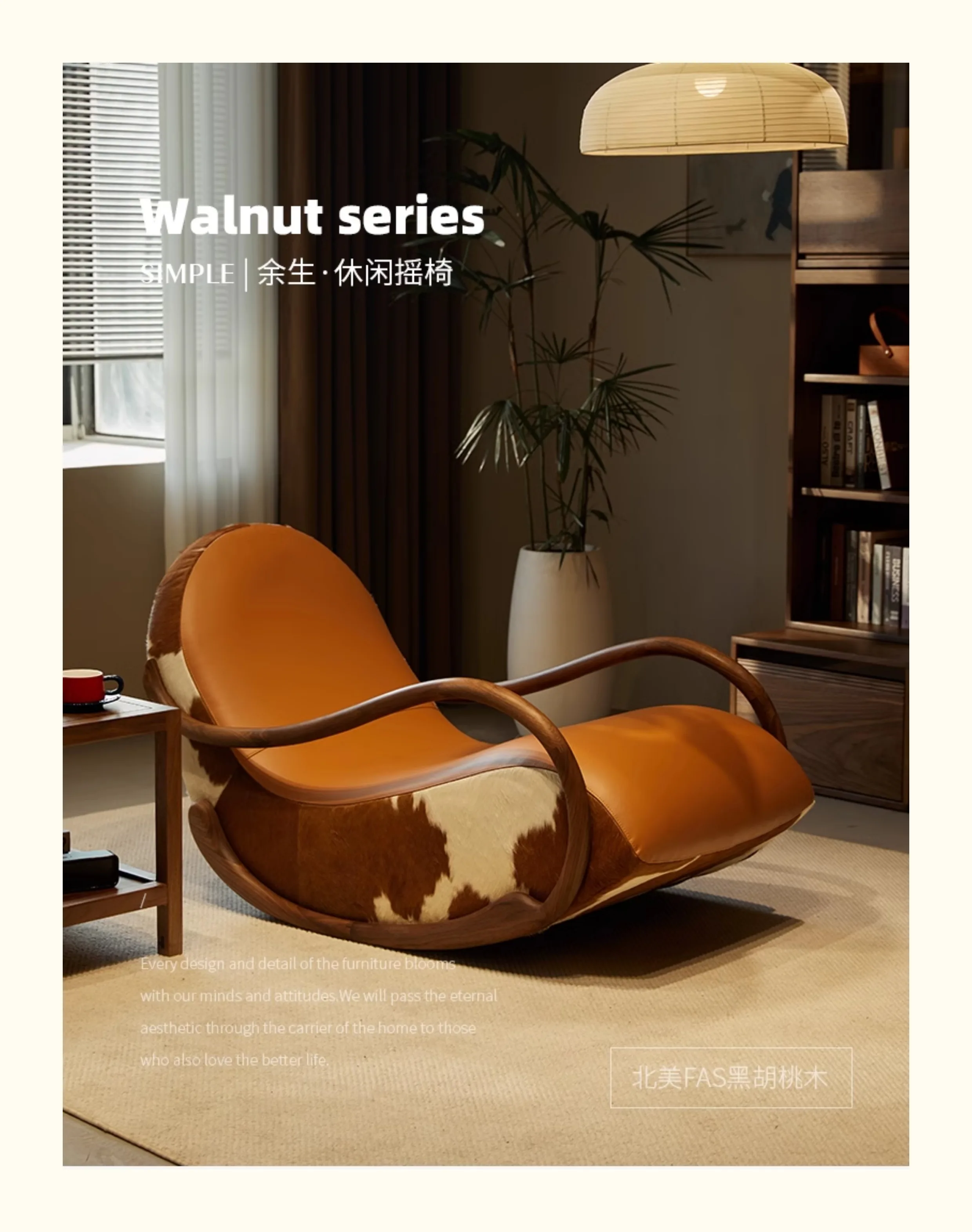 Dieser exklusive Schaukel-Relaxsessel aus schwarzem Walnussholz steht für modernes Wohnen auf höchstem Niveau. Inspiriert vom italienischen Design und nordischer Klarheit vereint der Stuhl natürliche Materialien, klare Linien und luxuriösen Komfort. Als stilvoller Blickfang passt er perfekt in hochwertige Wohnräume, elegante Schlafzimmer oder ruhige Balkon- und Leseecken.