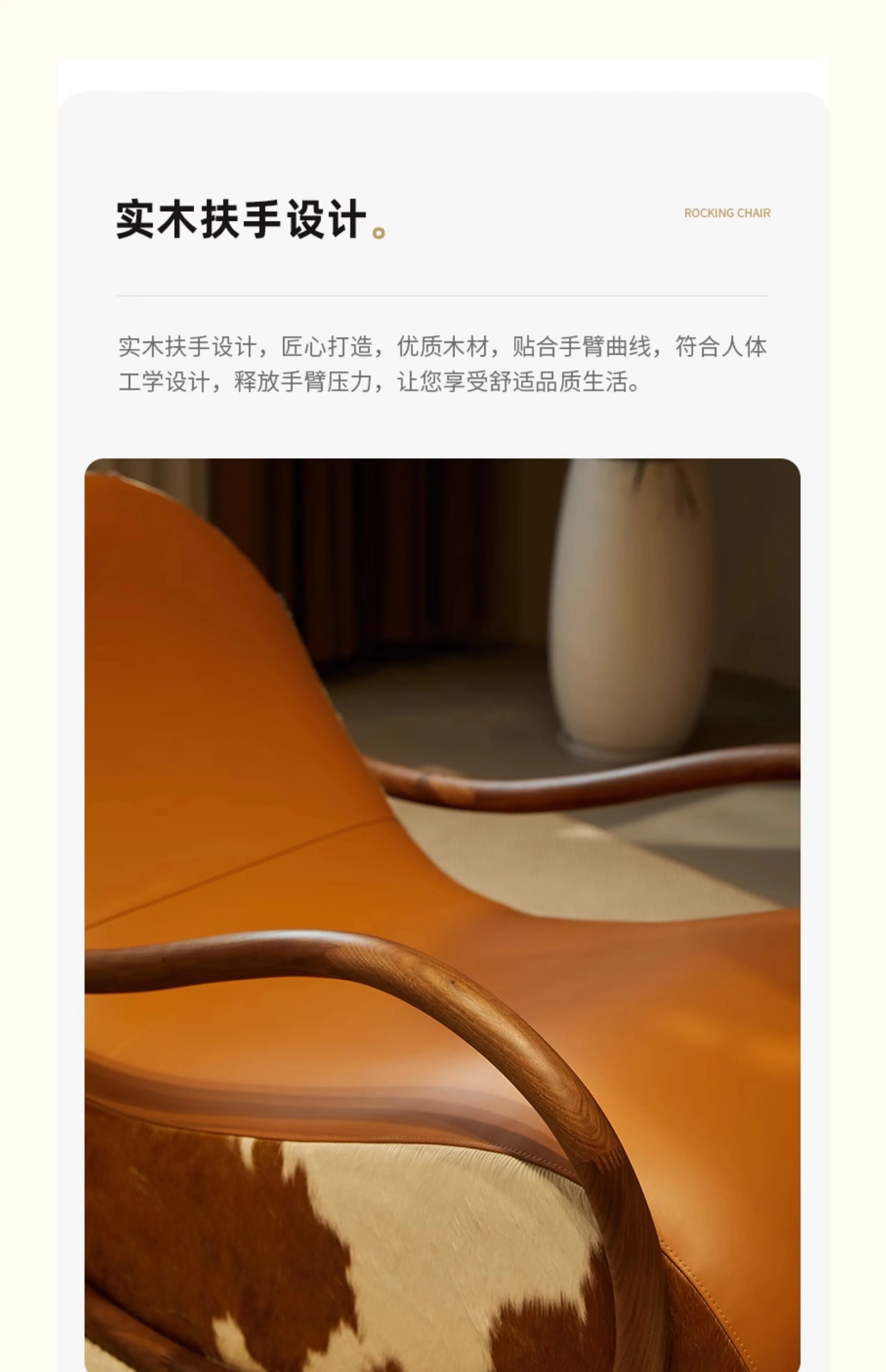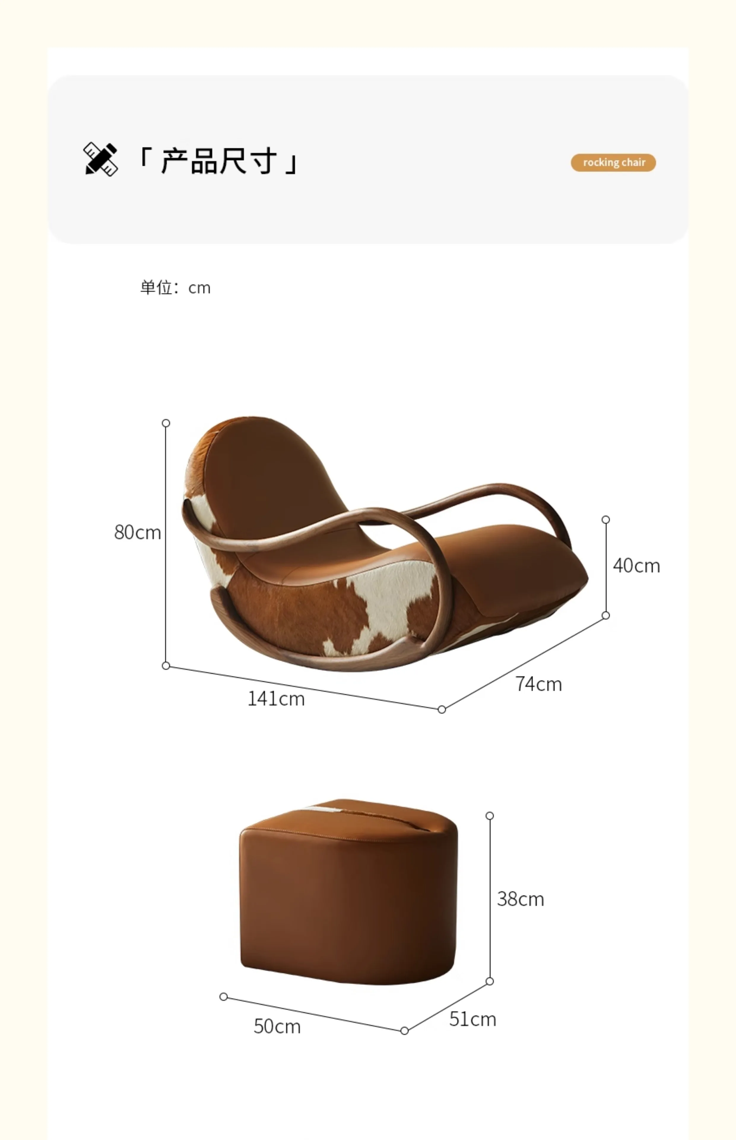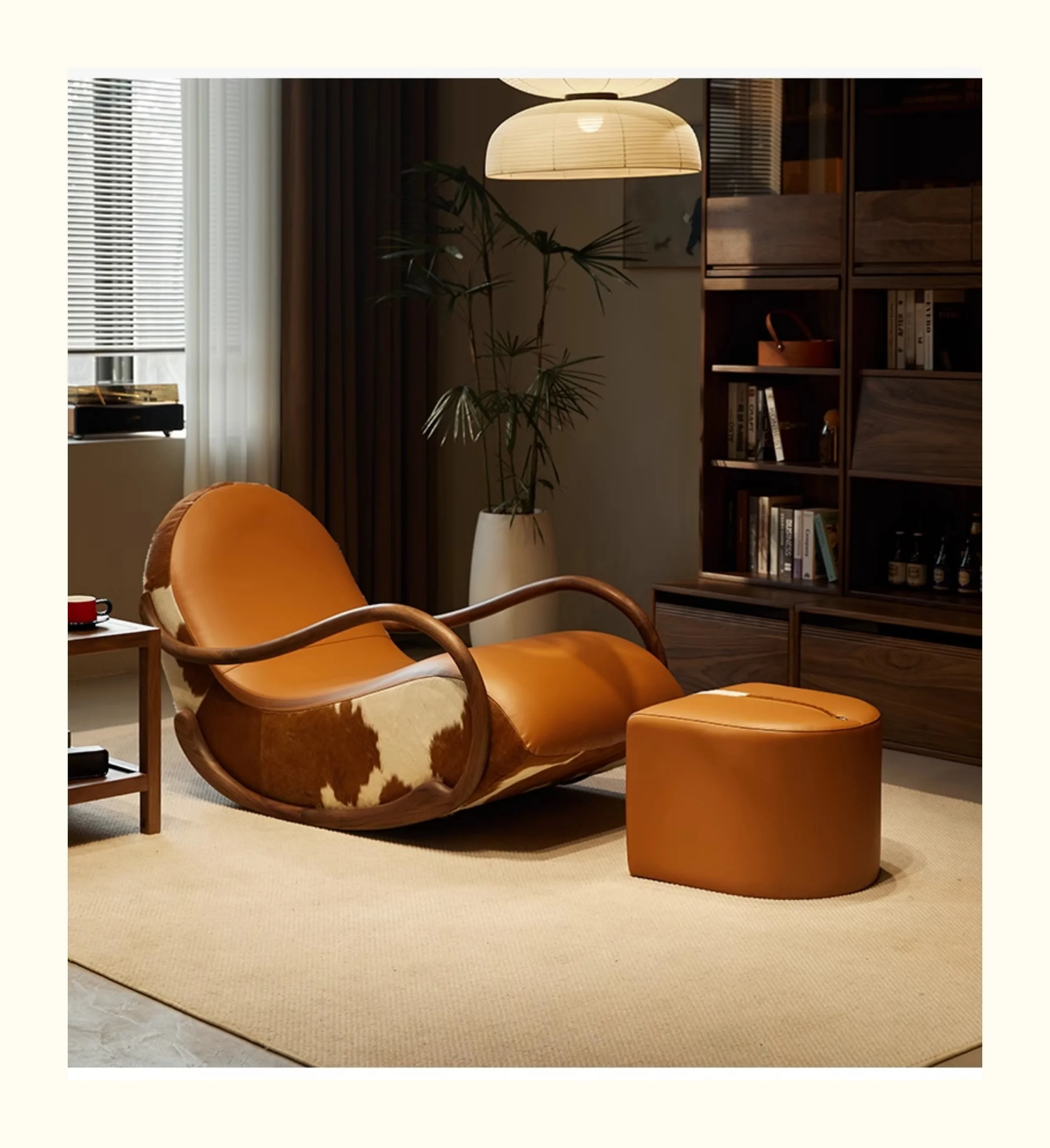 Die ruhige Schaukelbewegung fördert Entspannung und Wohlbefinden – perfekt zum Lesen, Abschalten oder Ausruhen nach einem langen Tag. Optional erhältliche Leder-Fußauflagen ergänzen den Sessel zu einer vollwertigen Relaxlösung. Dank seiner Multifunktion eignet sich der Stuhl für verschiedene Wohnbereiche und Nutzungszwecke.
