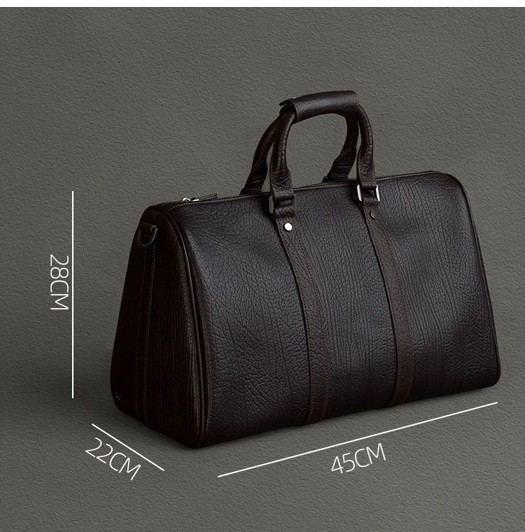 Mit einer Größe von ca. 45 × 28 × 22 cm bietet diese Leder Duffle Bag ausreichend Platz für Kleidung, Schuhe, Technik und persönliche Gegenstände. Sie eignet sich perfekt als Carry-On Handgepäck, Weekend Bag oder stilvolle Luggage Handbag. Der stabile Reißverschluss schützt den Inhalt zuverlässig und ermöglicht einen schnellen Zugriff unterwegs. Trotz des großzügigen Stauraums bleibt die Tasche mit ca. 1,8 kg angenehm tragbar.