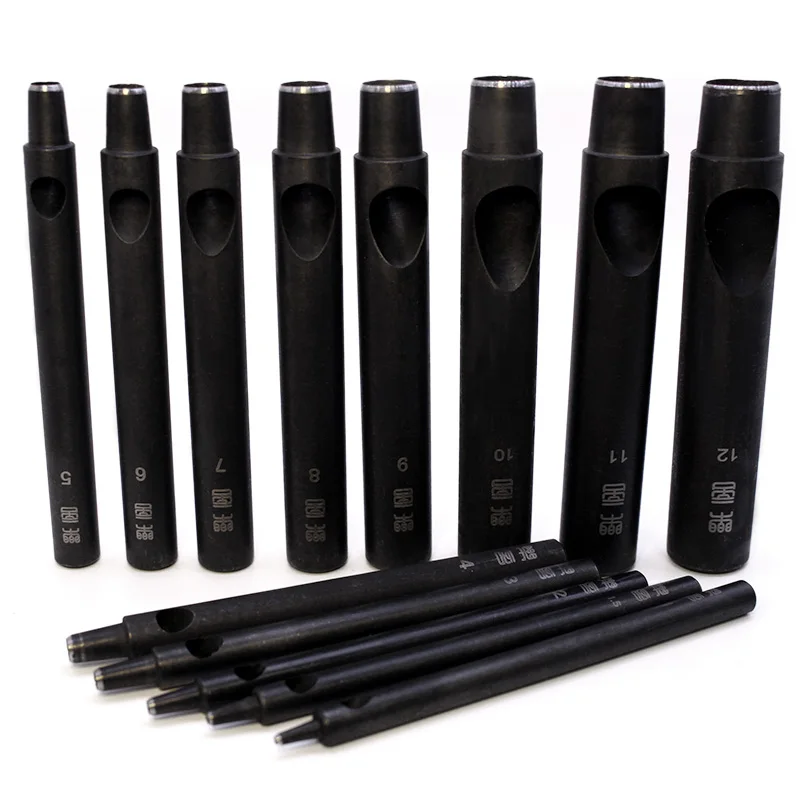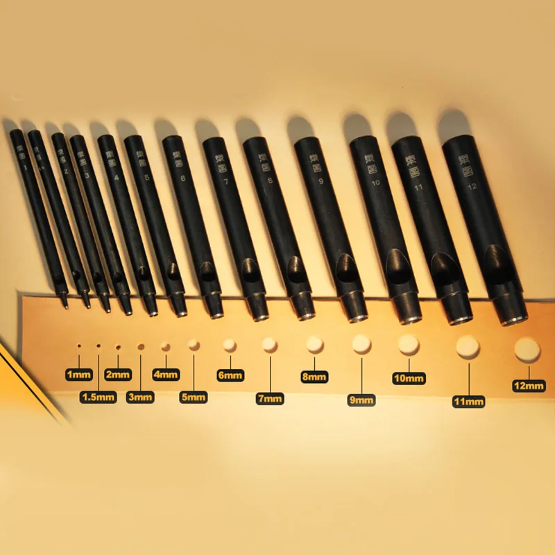 Das Set umfasst 12 verschiedene Lochdurchmesser von 1 mm bis 12 mm und bietet damit maximale Flexibilität für feine Detailarbeiten ebenso wie für robuste Lederstücke. Dank der exakt gearbeiteten Schneidköpfe entstehen saubere Lochkanten ohne Ausfransen.