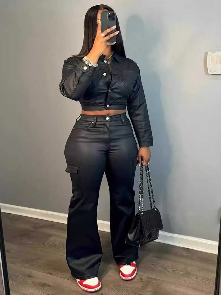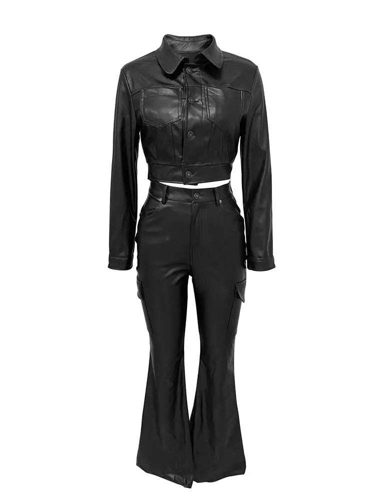 Pants Autumn and Winter Long Sleeve Pu Leather 2 Piece Outfits for Women Wholeale Drop ship