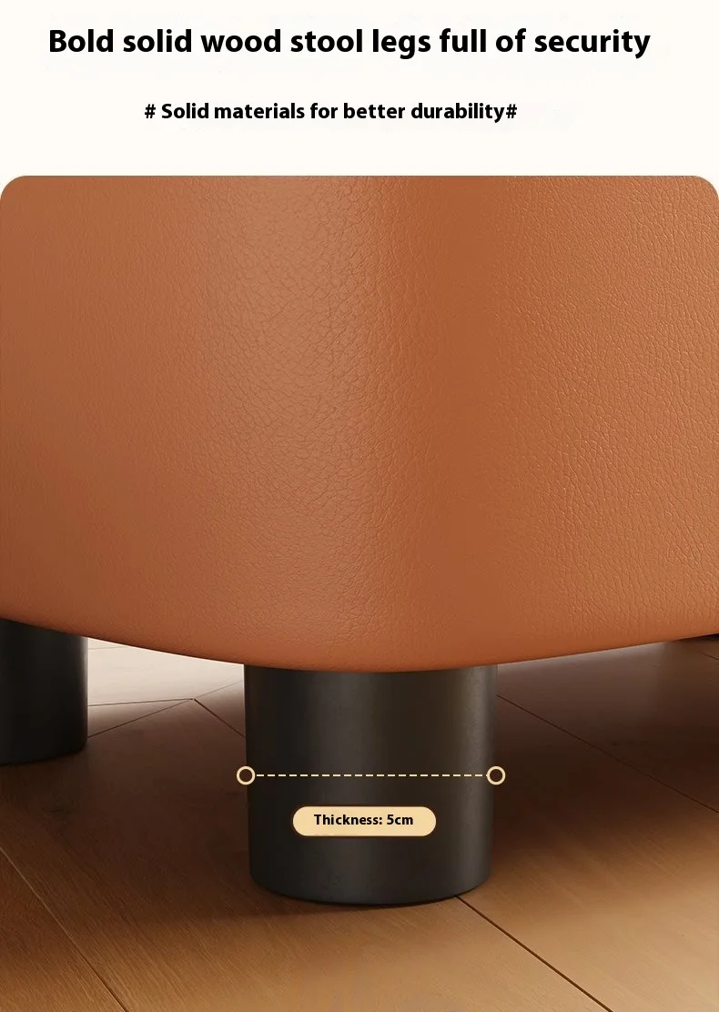 Die Sitzfläche ist mit strapazierfähigem PU-Leder bezogen, das sich angenehm weich anfühlt und gleichzeitig pflegeleicht ist. Verschmutzungen lassen sich einfach abwischen – perfekt für den Einsatz im Flur. Der stabile Rahmen aus massivem Holz sorgt für hohe Standfestigkeit und Langlebigkeit. Die Kombination aus Lederoptik und Naturholz verleiht dem Hocker eine warme, moderne Ausstrahlung.