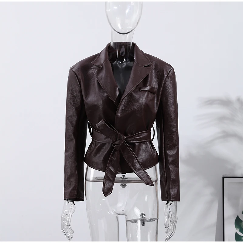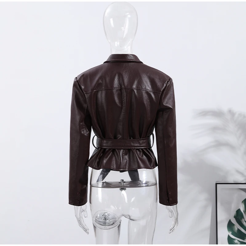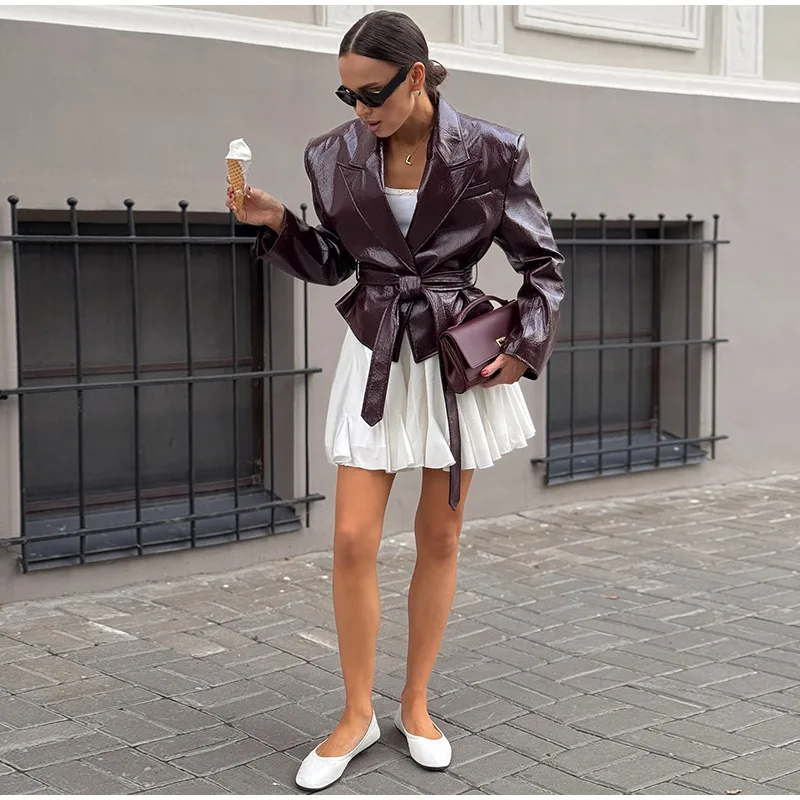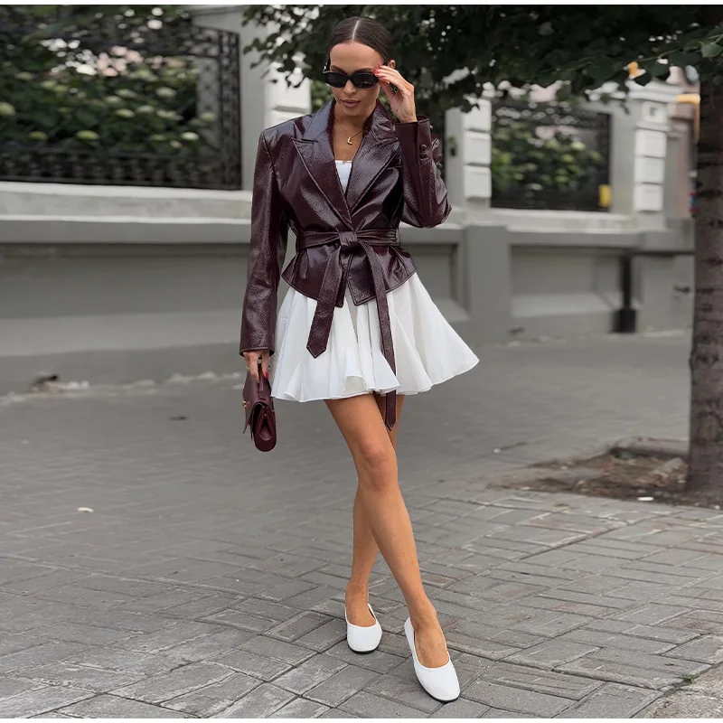 Vintage Damen Lederjacke mit Gürtel – Slim Fit Kurzjacke mit Schnürdetails, Reverskragen & Y2K High-Street Style