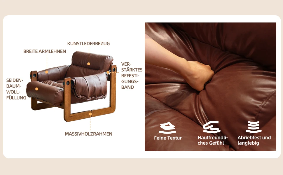 Im Inneren sorgt eine bequeme Schaumstoffpolsterung für ein angenehmes, unterstützendes Sitzgefühl. Die Sitzfläche ist weich, aber formstabil, sodass Sie auch über längere Zeit bequem sitzen können. Die komfortablen Armlehnen laden zum Zurücklehnen und Entspannen ein – perfekt zum Lesen, Fernsehen oder einfach zum Abschalten nach einem langen Tag.