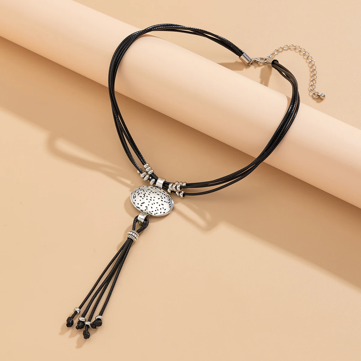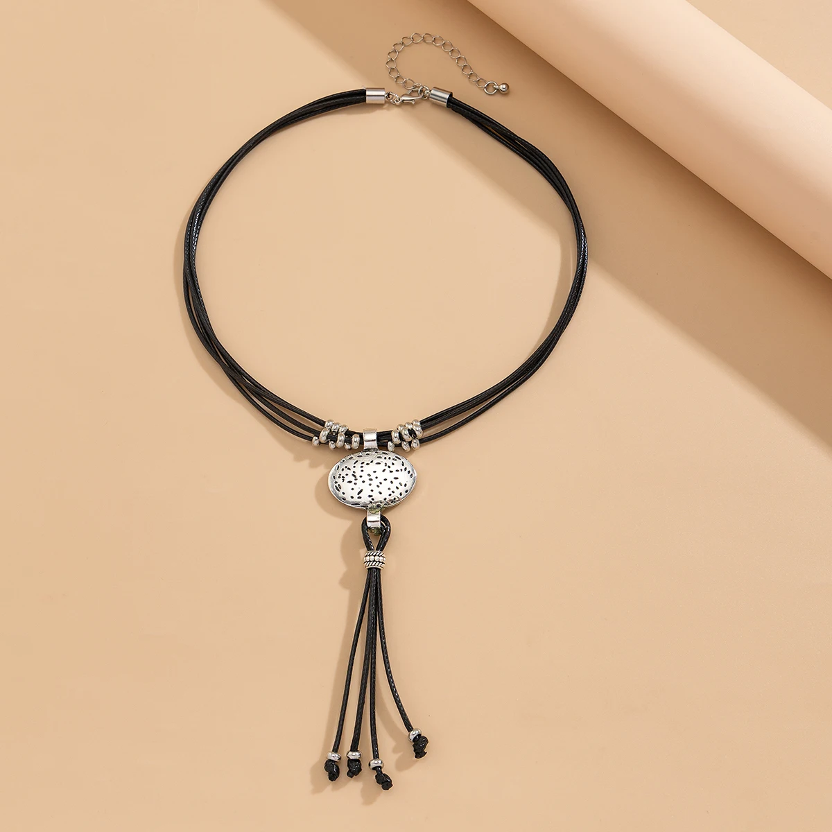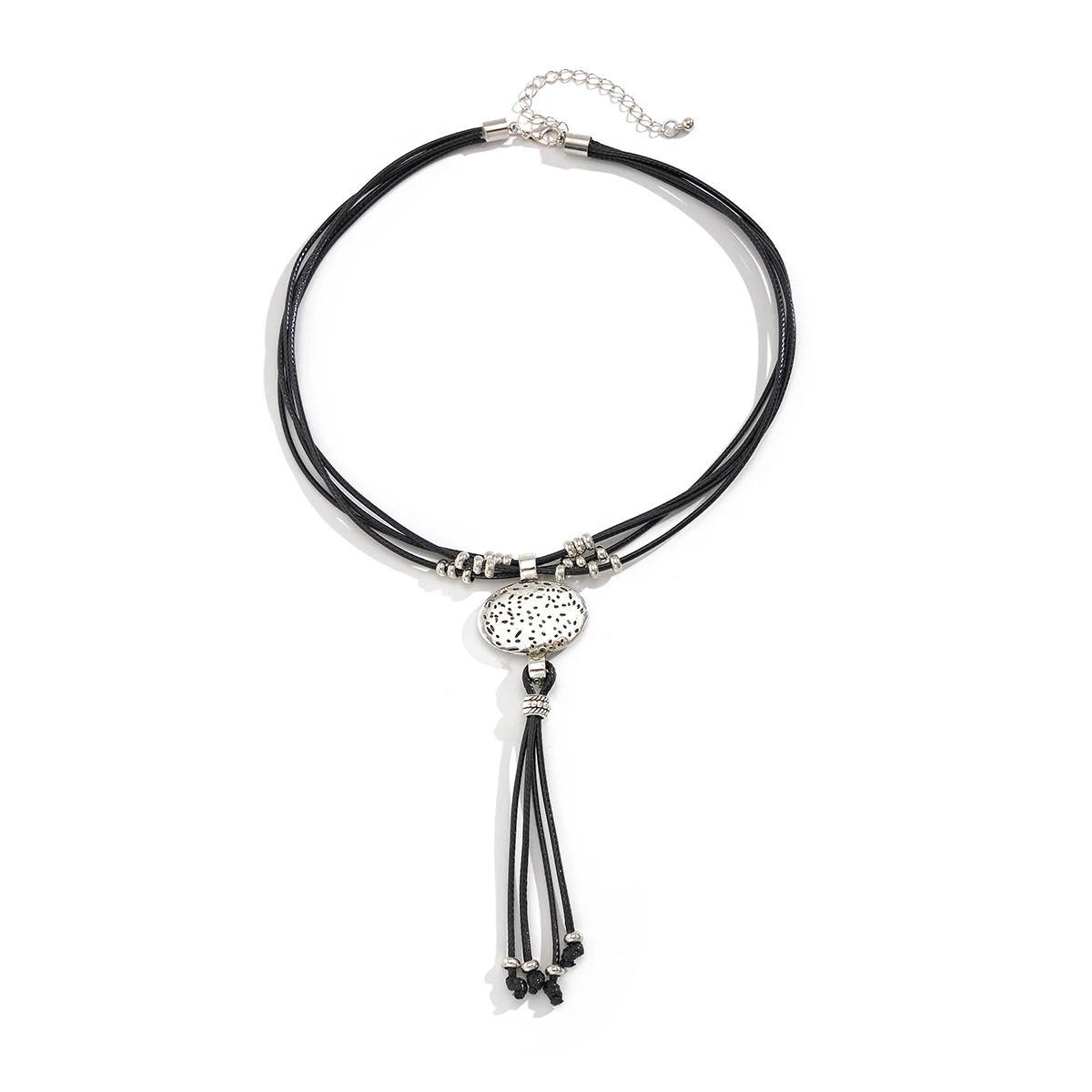 Vintage Leder-Wachs Halskette mit rundem Silberanhänger & Quaste – Ethnischer Boho Schmuck für Damen im Retro-Stil